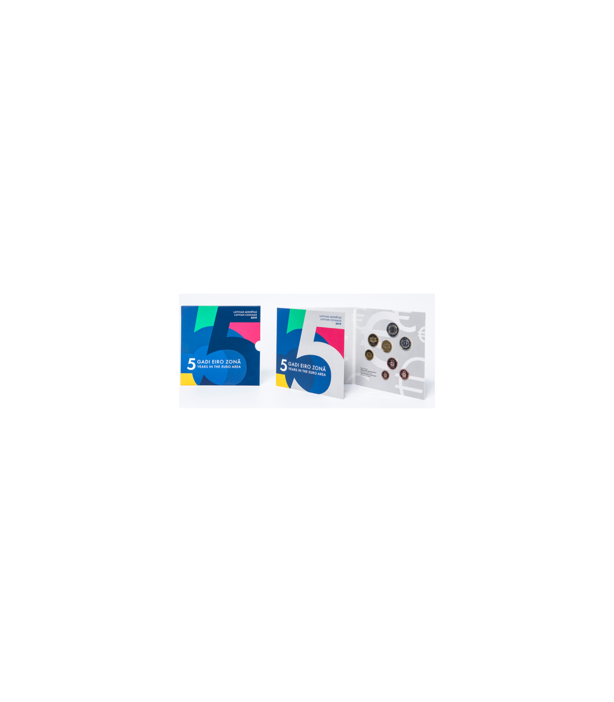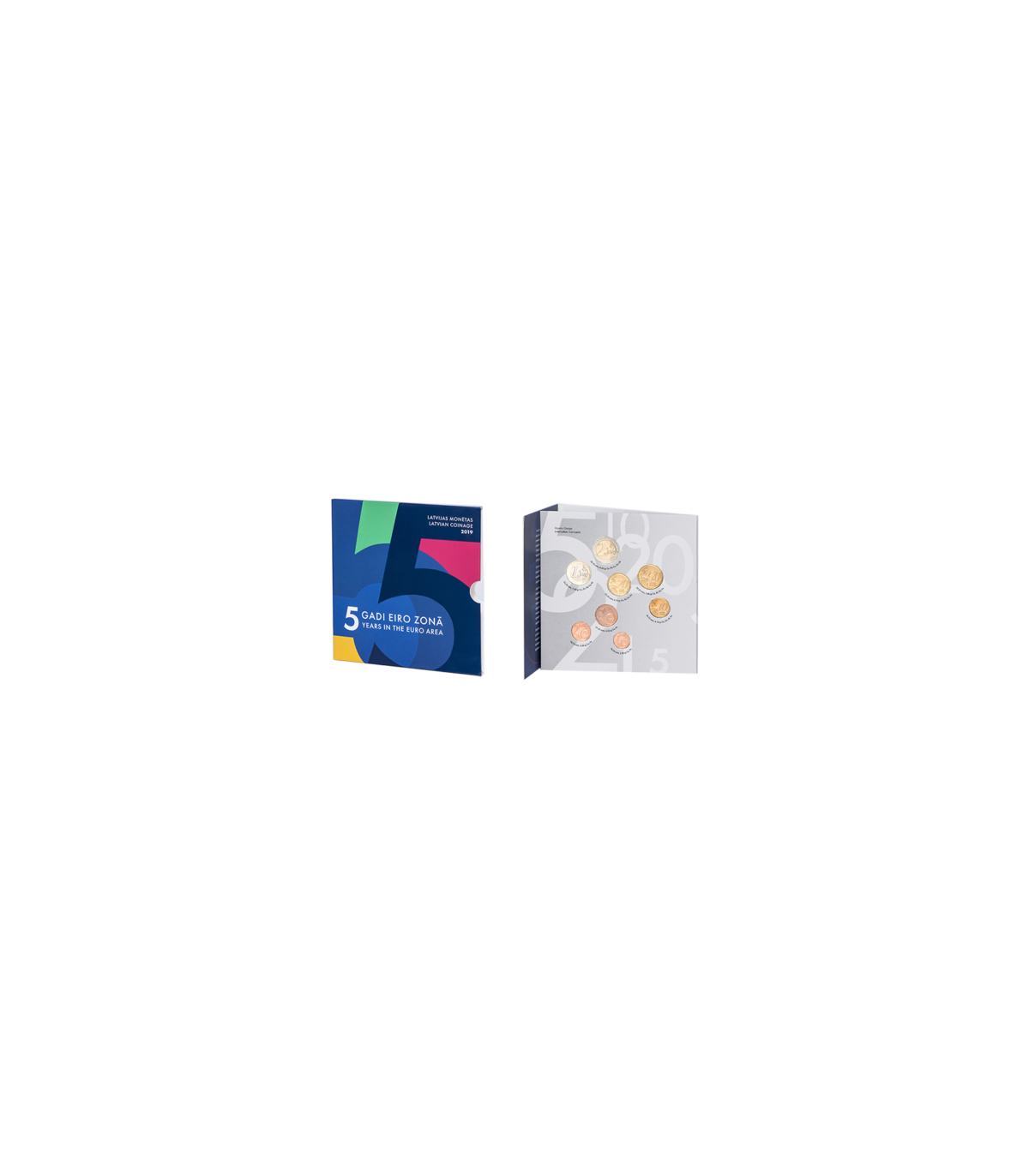Cofanetto fdc anno 2019 comprendente una serie di 8 monete da 1 centesimo a 2 euro Lettonia 2019 sul tema del 5° anniversario dell'ingresso della Lettonia nella zona euro e dell'utilizzo della moneta comune