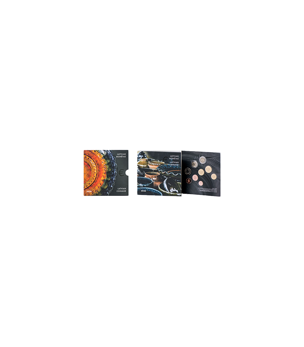 Set di 8 monete in un cofanetto lucido universale BU con i valori da 1 centesimo a 2 euro Lettonia 2020 e la moneta commemorativa da 2 euro sul tema della ceramica lettone.