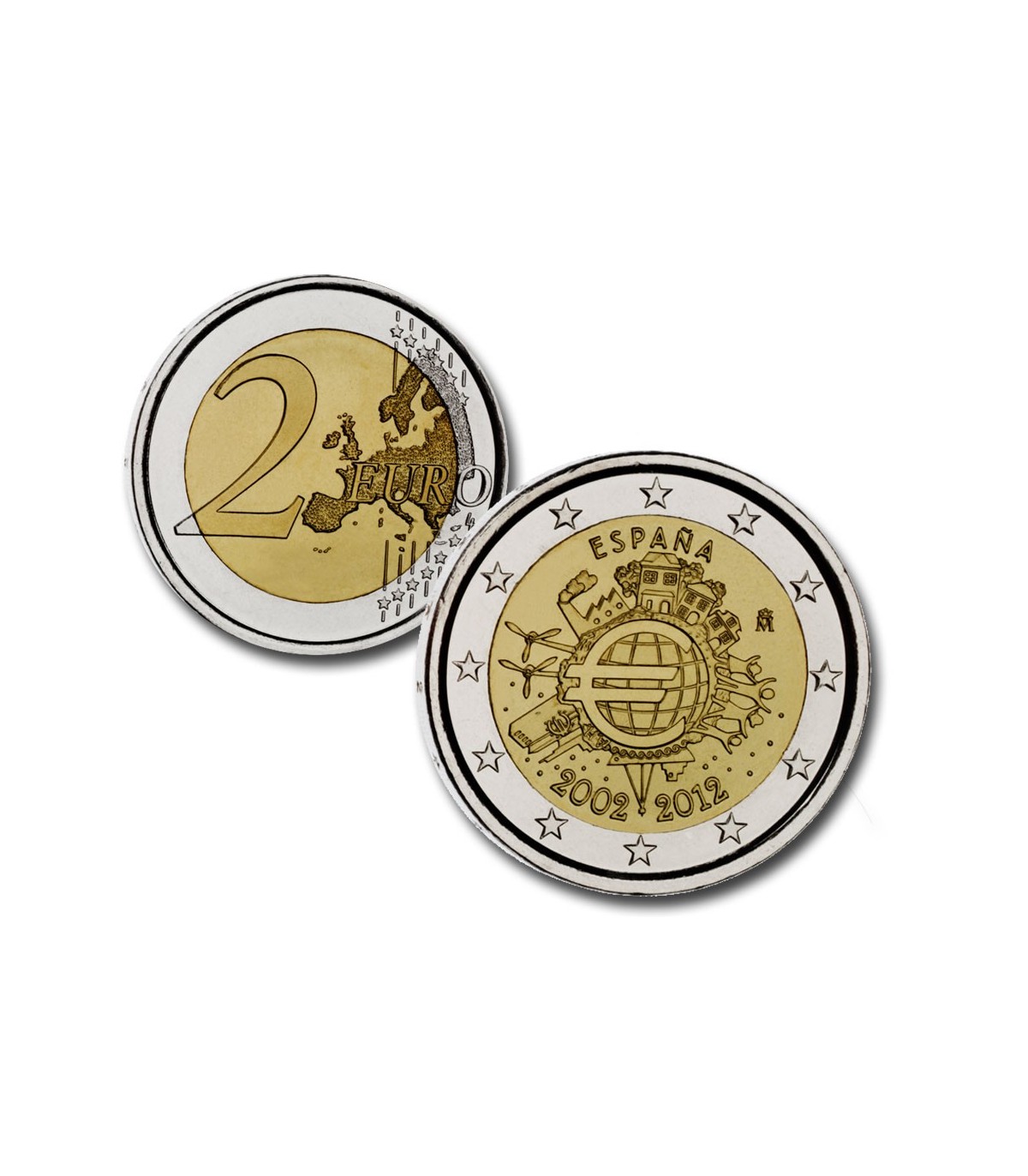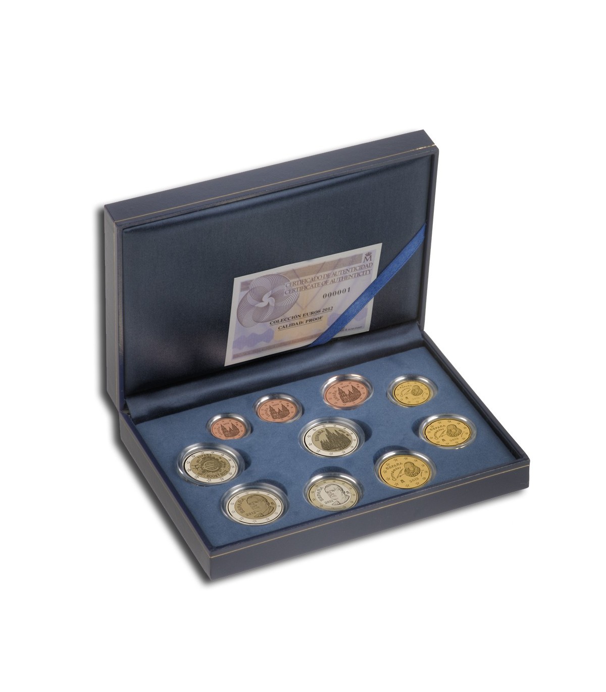 Serie in cofanetto ufficiale BE 2012 di 10 monete comprendente le 8 monete da 1c a 2€ di Juan-Carlos nell'annata 2012 più la 2 euro commemorativa raffigurante la Cattedrale di Santa Maria de Burgos e la 2 euro per il 10° anniversario delle banconote e monete in euro.