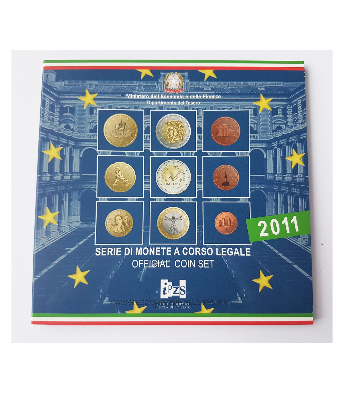 Cofanetto di qualità FDC 2011 comprendente 9 monete, che raggruppa le 8 monete da 1 centesimo a 2 Euro Italia 2011 + il 2 Euro commemorativo sul tema del