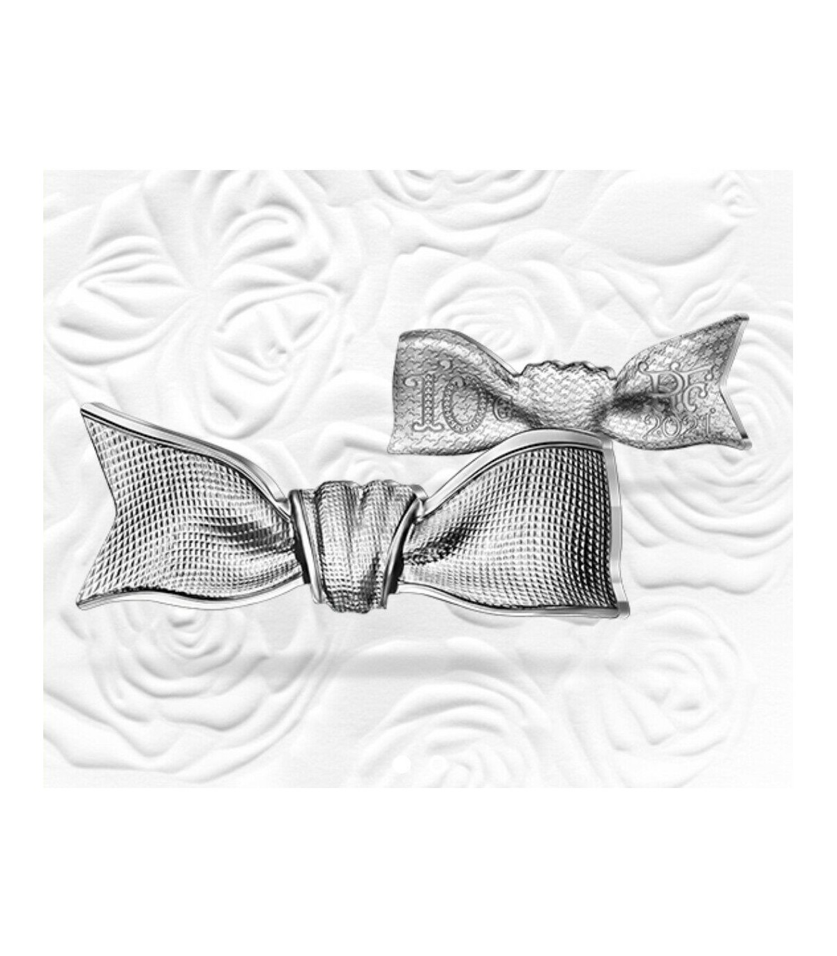 Questa moneta a forma di nodo, omaggio al flacone Miss Dior, riproduce perfettamente l'illusione del tessuto grazie all'incisione e al volume. Il rovescio della moneta raffigura il famoso emblema pied-de-poule della Maison Dior.