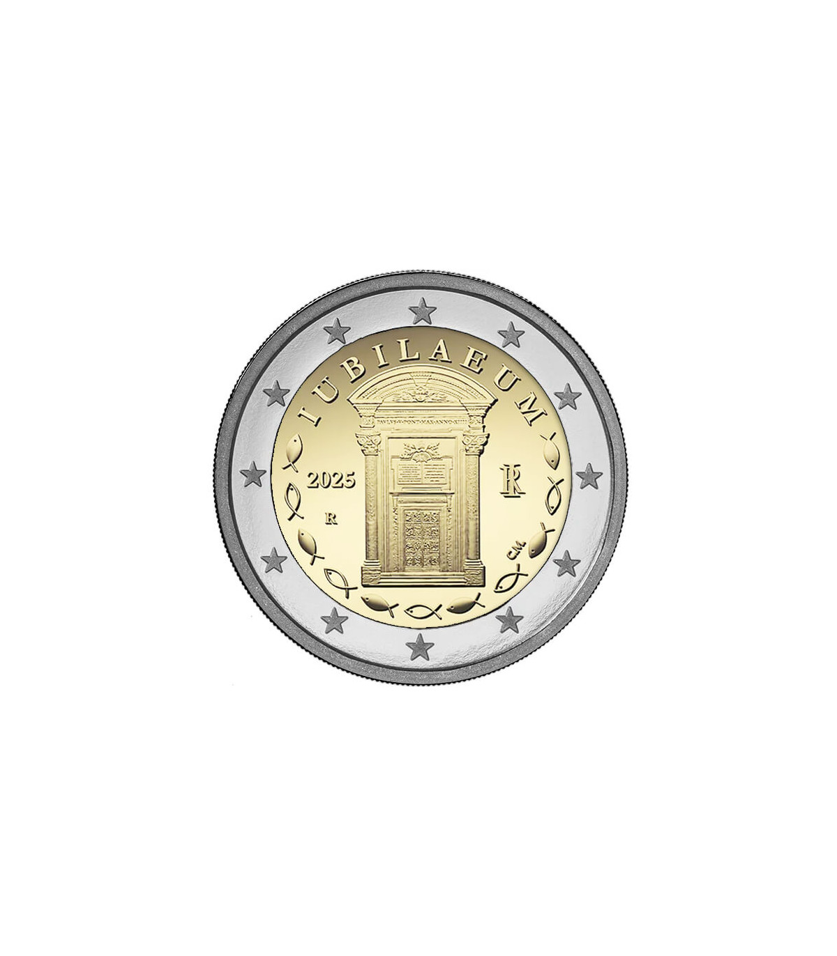 In het midden staat een afbeelding van de Heilige Deur in de Sint-Pietersbasiliek. Bovenaan is het woord "IUBILAEUM" gegraveerd, terwijl langs de rand een reeks vissen afwisselend vol en leeg de Latijnse inscriptie omlijst, die het christendom symboliseert. Links staat het jaar van uitgifte "2025" en de "R" voor de Romeinse munt. Rechts staan de initialen van het land "RI" en rechtsonder de initialen "CM" van de ontwerpster van de munt, Claudia Momoni.
