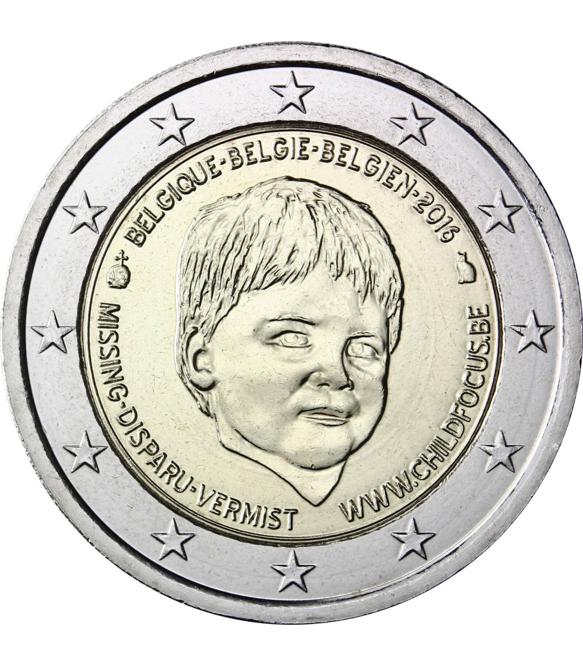 België viert Internationale Dag van de Vermiste Kinderen met de "Child Focus"-munt die ter nagedachtenis aan iedereen wordt uitgegeven. Child Focus is de algemene naam van het Europees Centrum voor Vermiste en Seksueel Uitgebuite Kinderen. De mensen van Child Focus bieden psychologische en juridische ondersteuning aan de slachtoffers van deze gebeurtenissen (zowel kinderen als hun ouders). Ze volgen ook hun zaken op en zorgen ervoor dat ze, in sommige gevallen, met zorg worden behandeld door de verantwoordelijken. Tot slot helpen en verspreiden ze informatie over vermiste kinderen door hun foto's en beschrijvingen te publiceren in kranten, tijdschriften, etc. De afbeelding van het kind op de munt is van Liam Vanden Branden, die twintig jaar geleden verdween. Liam is het jongste kind dat in België is verdwenen en nog niet is teruggevonden, en is de belichaming van alle vermiste kinderen. Aan de binnenkant van de munt staat het gezicht van het kind, omringd door het opschrift "MISSING-DISPARU-Vermist", "WWW.CHILDFOCUS.BE" en de drietalige nationaliteitsaanduiding "BELGIQUE-BELGIE-BELGIEN.