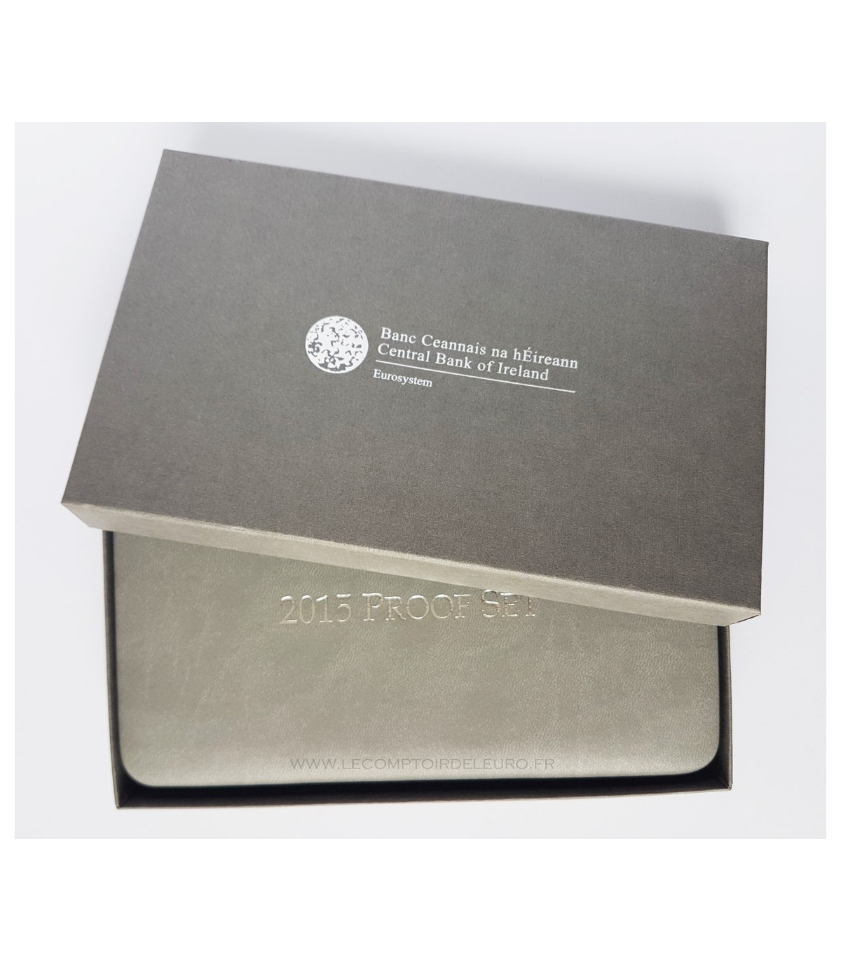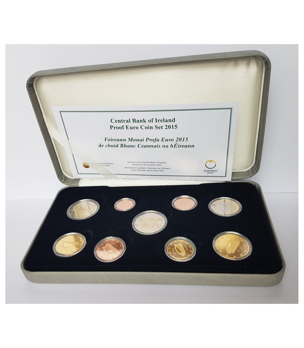 Serie in een Fine Proof Box BE Ierland 2015 bestaande uit 9 munten die de 8 munten van de 1 cent tot de 2 euromunt combineren + de herdenkingsmunt van 2 euro "10 jaar euro".