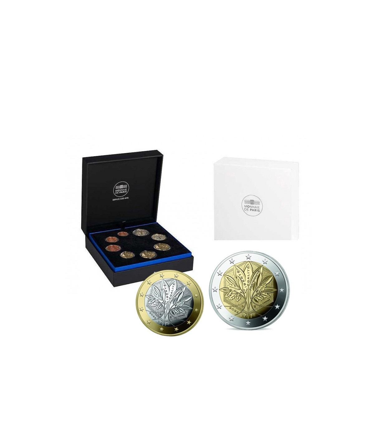 Het nieuwe ontwerp van de munten van €1 en €2 met de afkorting Union is aanwezig in de set