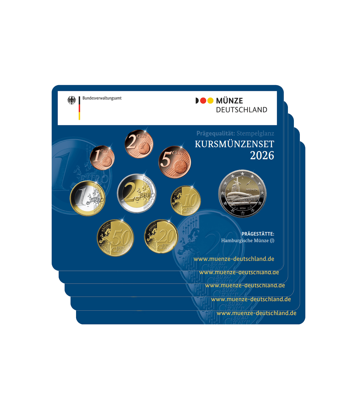 Deze set bevat de 5 Duitse euroseries 2026 (A, D, F, G, J), elk bestaande uit 9 munten: de 8 waarden van 1 cent tot 2 euro, evenals de herdenkingsmunt van 2 euro met de regio Bremen als thema. Elke set, geslagen in Universal Brilliant (BU) kwaliteit, wordt geleverd in zijn originele officiële doos. Een must-have verzameling voor numismatische liefhebbers!