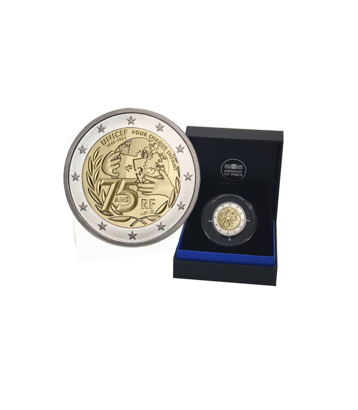 In 2021 is het 75 jaar geleden dat UNICEF (United Nations International Children's Emergency Fund) werd opgericht, verantwoordelijk voor het verdedigen van de rechten van de meest kwetsbare kinderen en het voorzien in hun basisbehoeften over de hele wereld. Om deze verjaardag te vieren, heeft de Parijse Munt besloten om de inzet van UNICEF te eren en te ondersteunen door een collectie herdenkingsmunten van €2 te creëren. Voor elke gekochte 2€ BE of 2€ BU verzamelaarsmunt doneert de Munt van Parijs 2€ aan UNICEF.