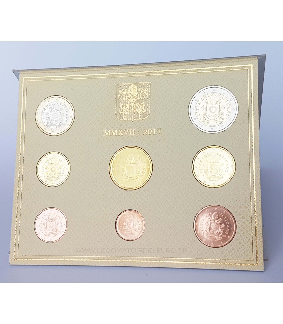 Deze set bevat de 2017 munten van €1 tot €2 met het wapen van paus Franciscus I (schild)