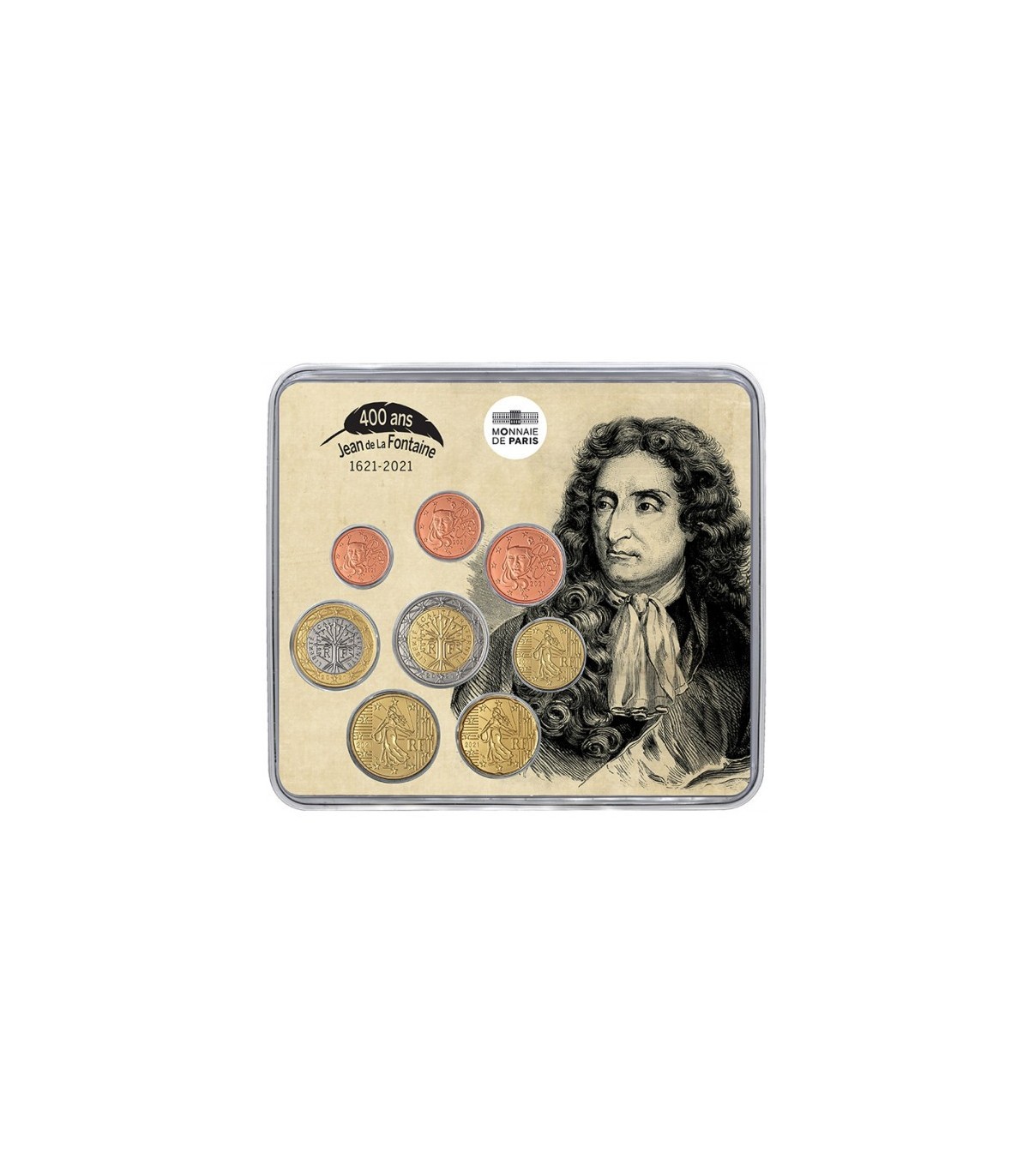 Op het gezicht staat een gegraveerd portret van Jean de la Fontaine op een gestructureerde achtergrond die doet denken aan oude boeken. Het pictogram dat Thomas BAAS speciaal voor de Parijse Munt heeft gemaakt ter gelegenheid van zijn 400ste geboortedag is ook afgebeeld, net als het logo van de Parijse Munt. De gezichten van de 8 munten in de miniset zijn zichtbaar in de universele glanzende versie.