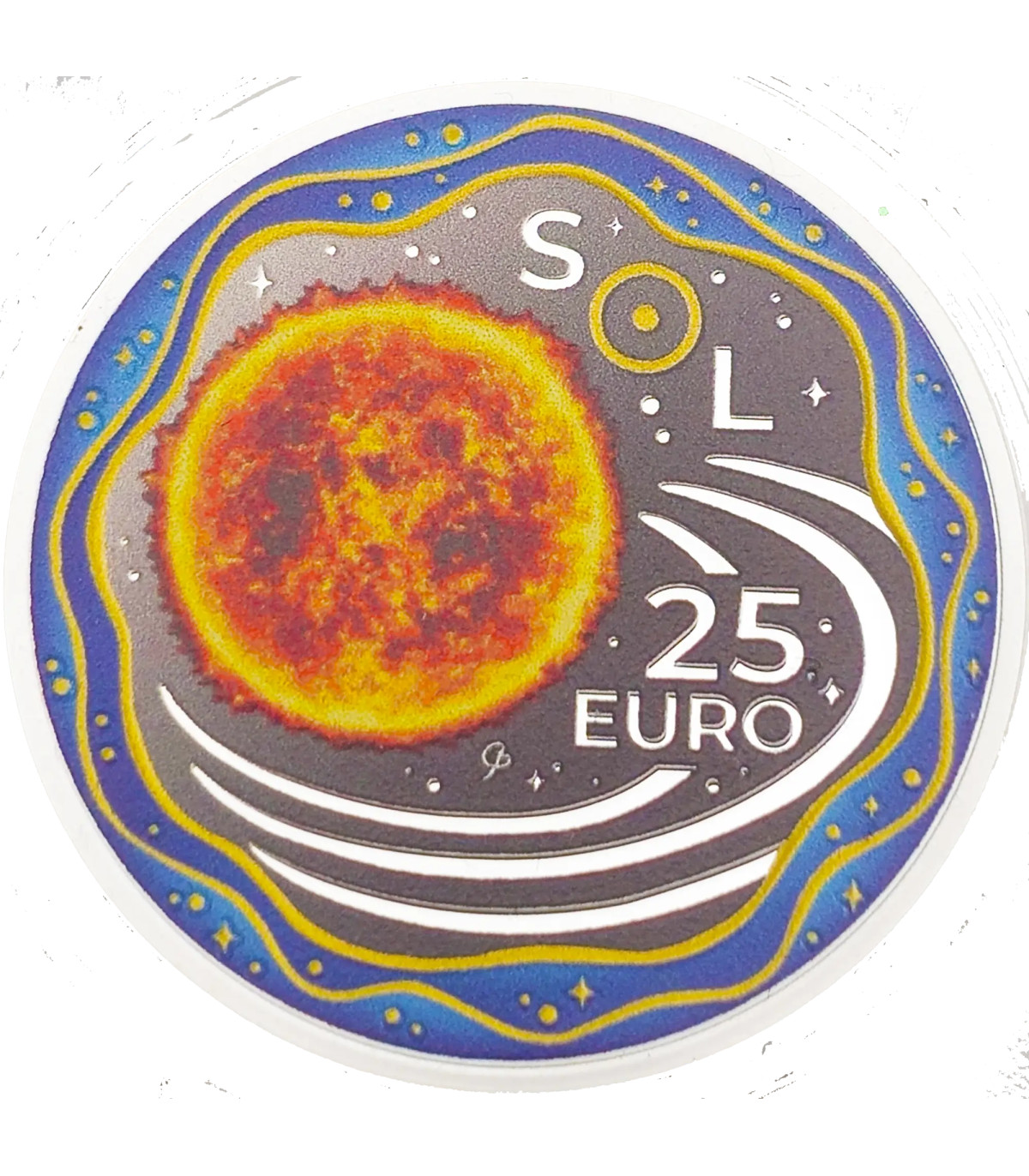 Herdenkingsmunt van 25 euro in zilver, uitgegeven door Luxemburg in 2025, gewijd aan de zon, de eerste in de collectie "Zonnestelsel", geleverd in fine proof kwaliteit met certificaat en verzamelalbum.