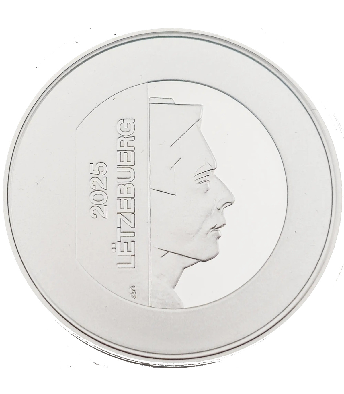 Op de achterkant staat een geometrisch portret van Zijne Koninklijke Hoogheid Groothertog Henri. Links van het portret, in verticale richting, zijn in twee regels de woorden "LËTZEBUERG 2025" gegraveerd.