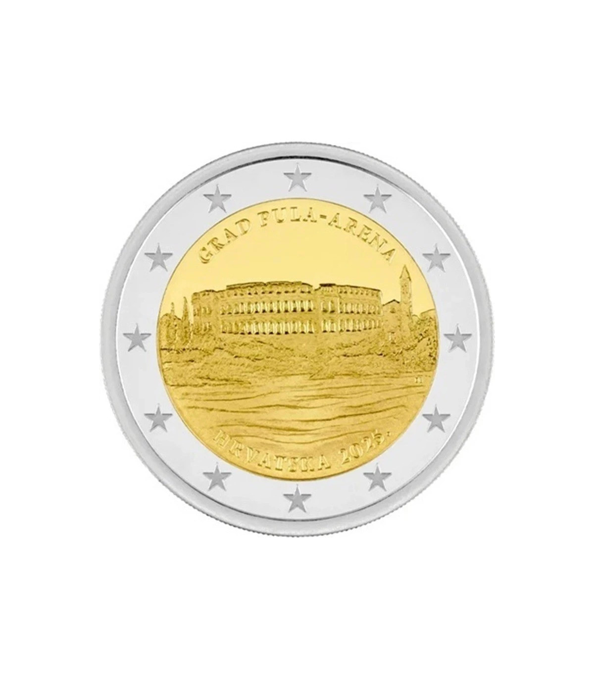 2 Euro Croatia 2025 met als thema de oude arena van Pula omringd door het natuurlijke landschap, vergezeld van de officiële opschriften en de ring met de twaalf sterren die de Europese Unie symboliseren.