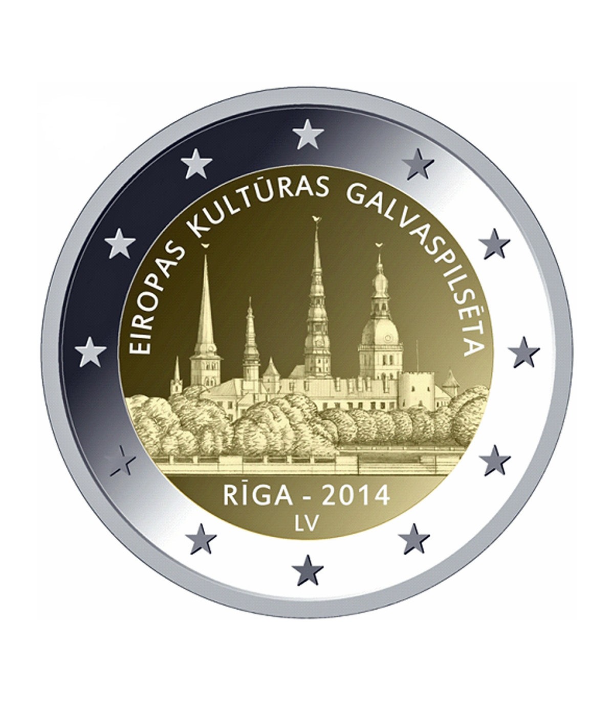 - Bovenaan staat het opschrift "Eiropas Kulturas GALVASPILSETA" (Culturele Hoofdstad van Europa), onderaan de naam van de stad en het jaar van uitgifte "RIGA - 2014" en onderaan het uitgevende land "LV". Oplage : 1.000.000.