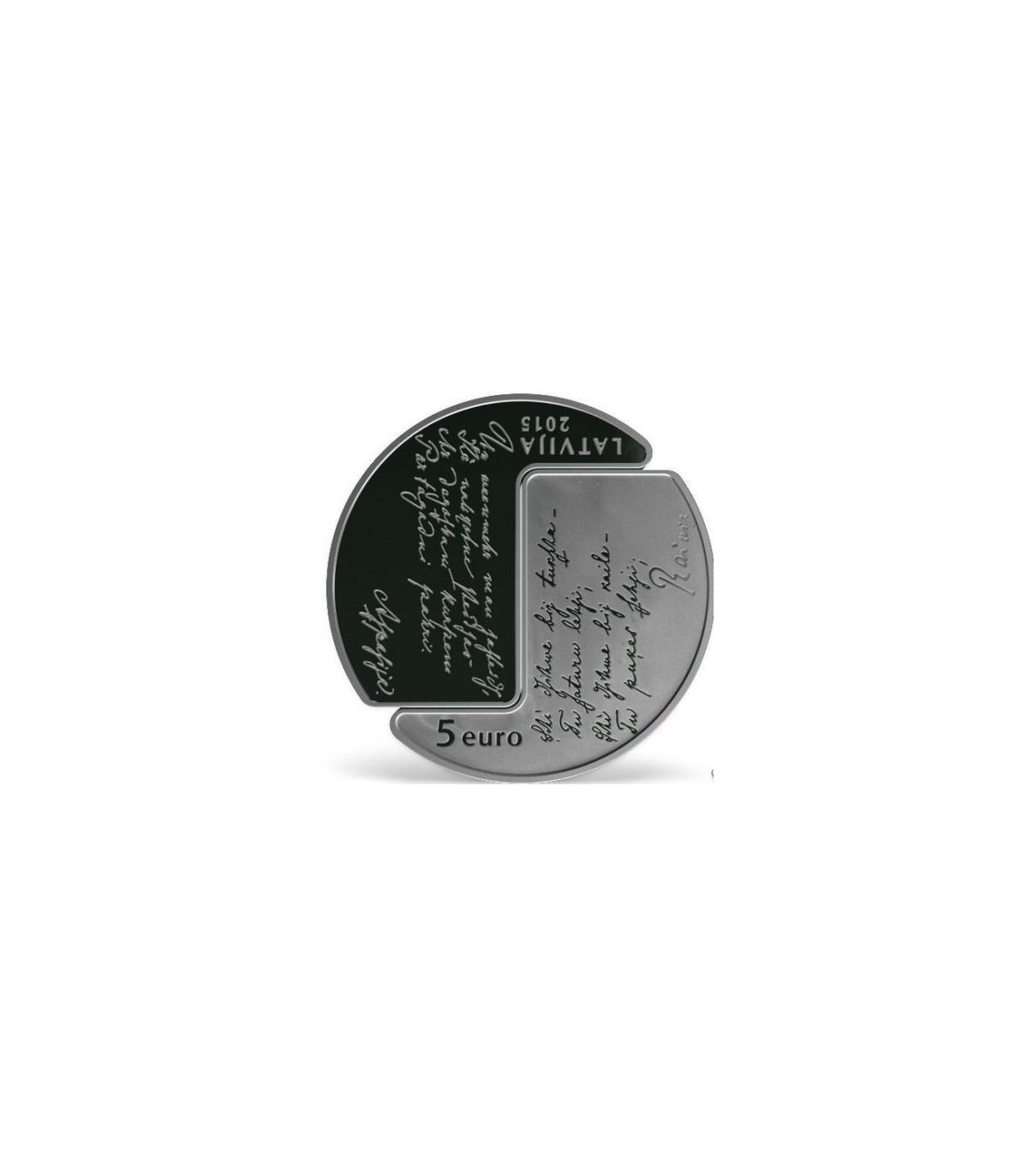 - De munt bestaat uit twee afneembare delen. Op het ene deel staat Rainis afgebeeld en op het andere Aspazija, versierd met rode bloemen. Verschillend in hun poëtische benadering (Rainis - ideeën; Aspazija - gevoelens), waren zij het belangrijkste paar in de Letse literatuur en cultuur.