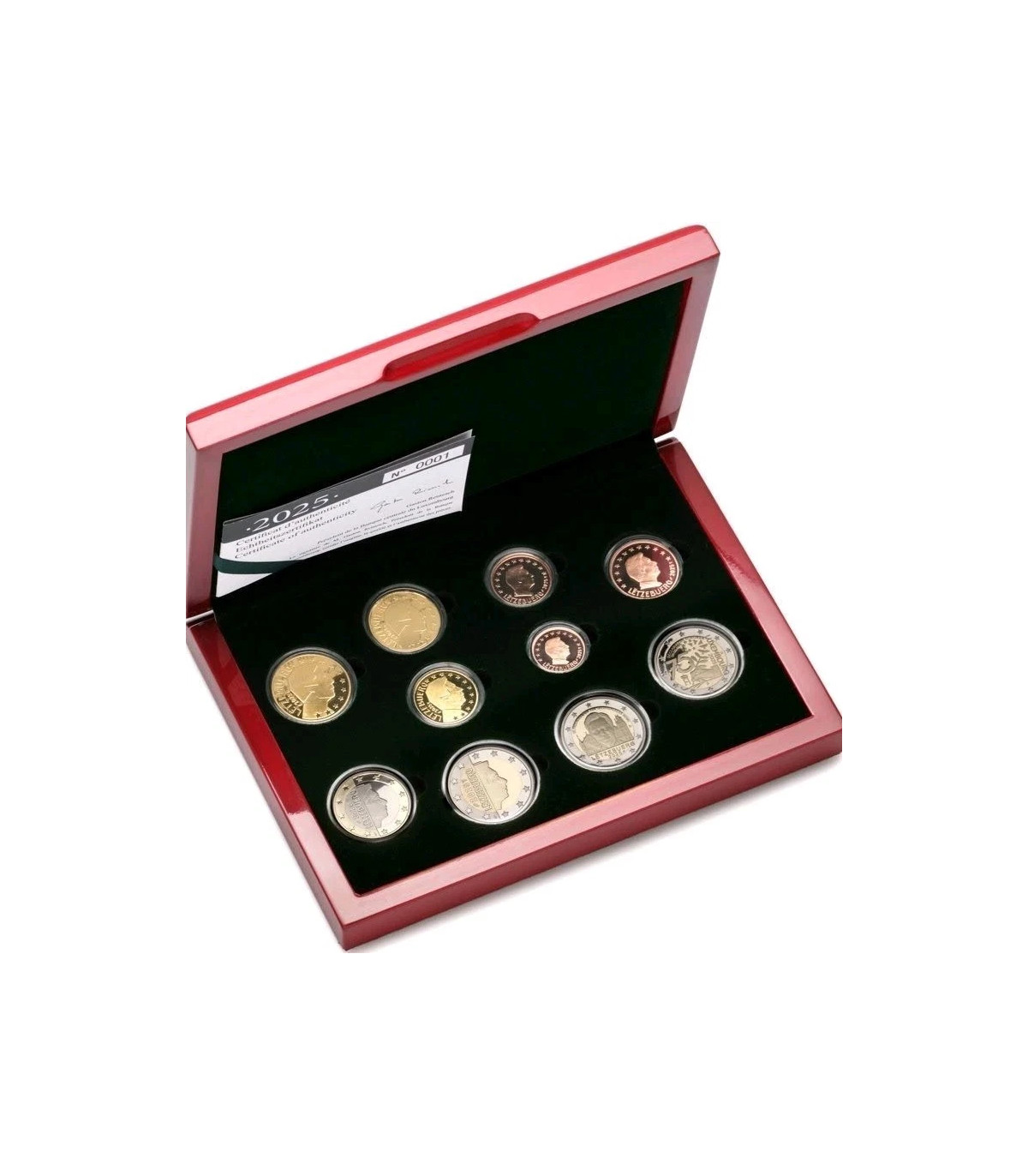De officiële Luxemburg 2025 doos in Fine Proof bevat de complete serie van 1 cent tot 2 euro en twee herdenkingsmunten van 2 euro met exclusieve stempels. Uitgegeven in een oplage van slechts 1.000 stuks, is dit een prestigieuze numismatische zeldzaamheid.