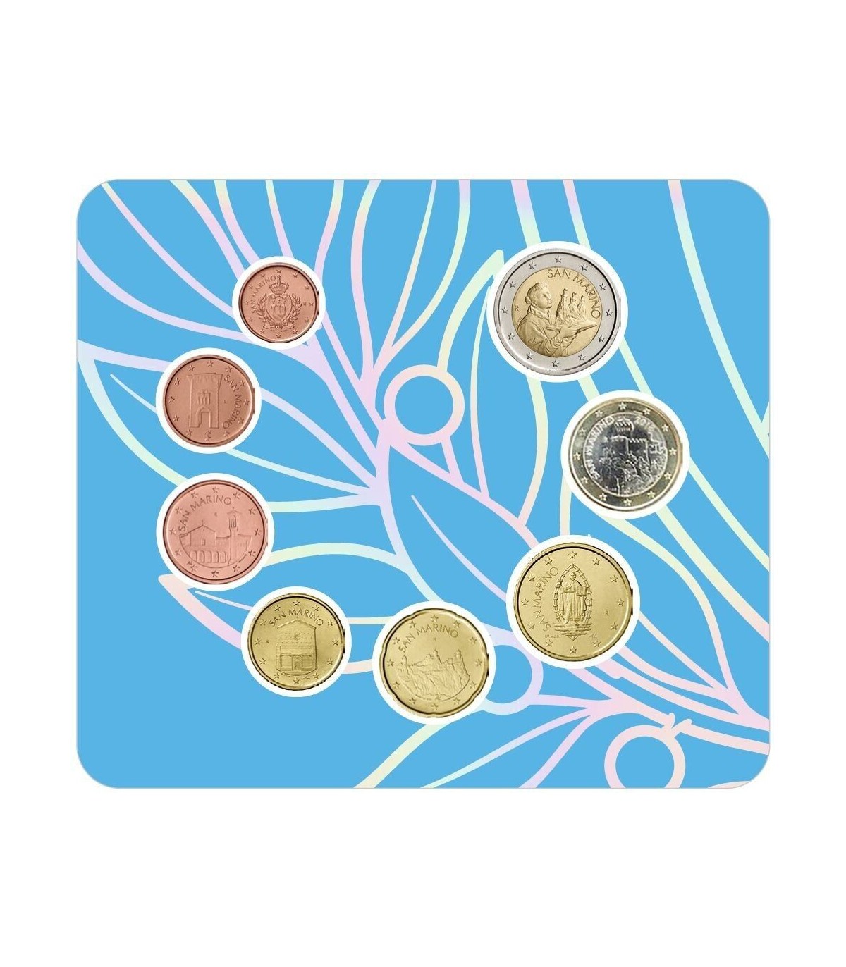 De nationale zijden zijn voorzien van nieuwe afbeeldingen met de naam van het land "SAN MARINO" (San Marino), het jaar van uitgifte en de twaalf sterren van de Europese Unie.