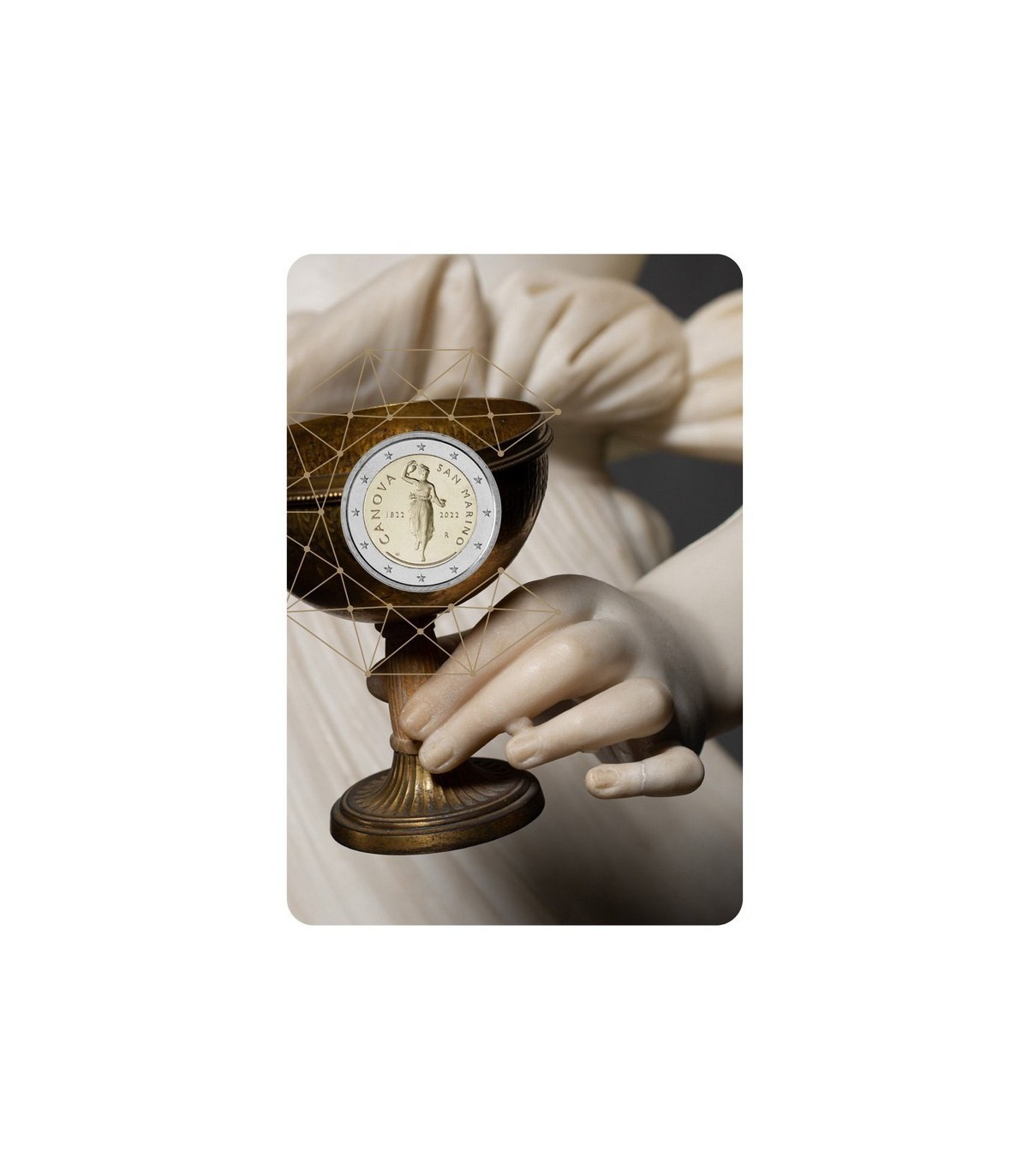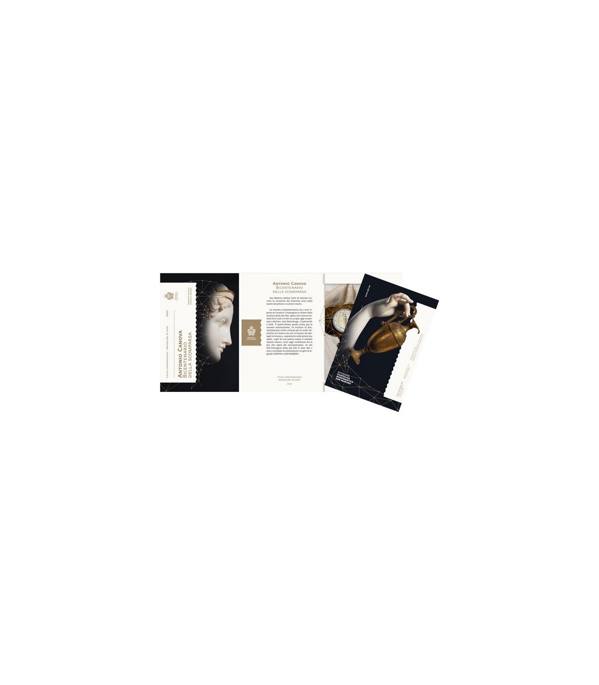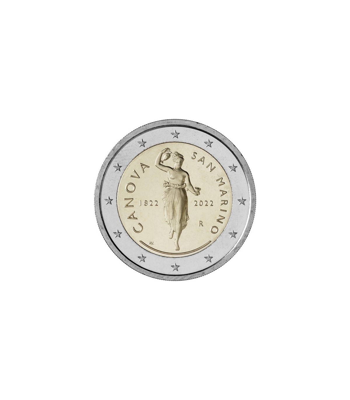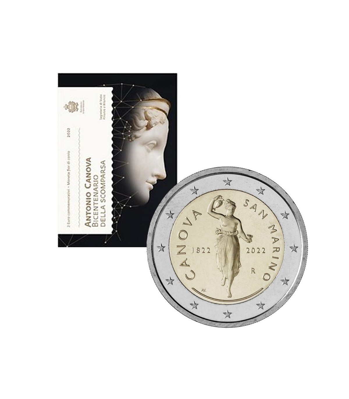 San Marino viert de kunst van Antonio Canova ter gelegenheid van de tweehonderdste sterfdag van de Venetiaanse schilder en beeldhouwer. Op de keerzijde van de herdenkingsmunt van €2 staat de reliëfafbeelding van het beeld van de godin Ebe, een werk dat Canova tussen 1796 en 1817 maakte in 4 kopieën die nu in Berlijn, Sint-Petersburg, Chatsworth en Forlì worden bewaard. Het was de laatste keuze voor het Sammarina-stuk. De beelden van Ebe, die aanvankelijk veel kritiek kregen vanwege Canova's stilistische keuzes, die bronzen en marmeren details combineerden en, vooral in de eerste twee werken, het gekonfijte witte marmer bedekten met een roze patina, worden nu beschouwd als een van de meest neoklassieke ter wereld. Naast de afbeelding van de godin Ebe staan de jaartallen 1822 en 2022 om te herinneren aan de viering en "rond" de legendes CANOVA en SAN MARINO.