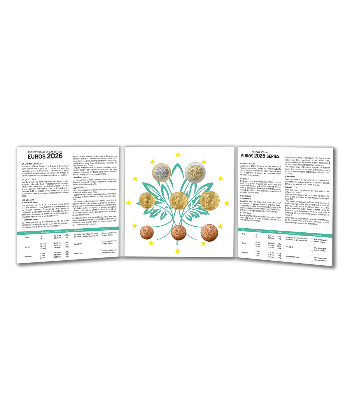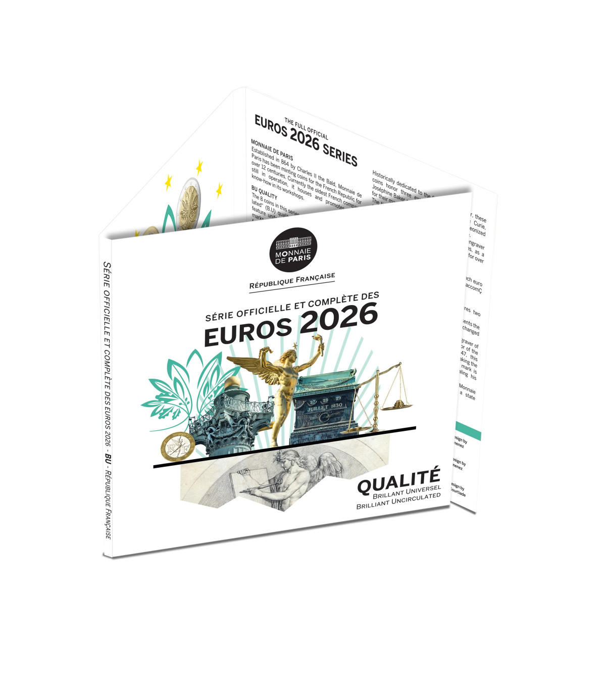 De officiële Monnaie de Paris BU 2026 boxed set bevat de 8 Franse munten van 1 cent tot 2 euro van het jaar 2026. De set wordt gepresenteerd in een moderne 3-luiksverpakking en toont de Universele munten van briljantkwaliteit, geleverd in hun originele doos.