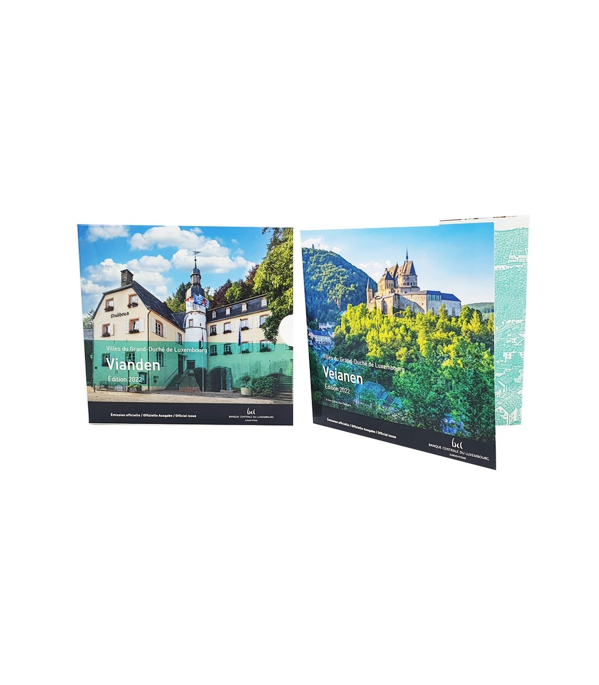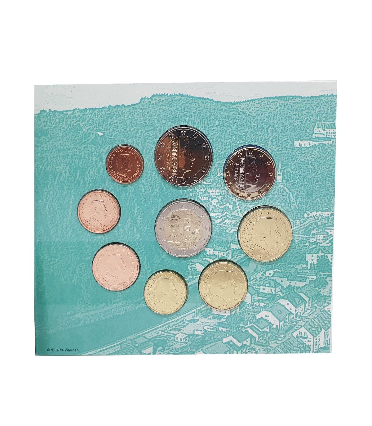 Universele doos Briljant Luxemburg 2022 met de 8 munten van het jaar en de herdenkingsmunt van 50 jaar Luxemburg driekleur , dus 9 munten.