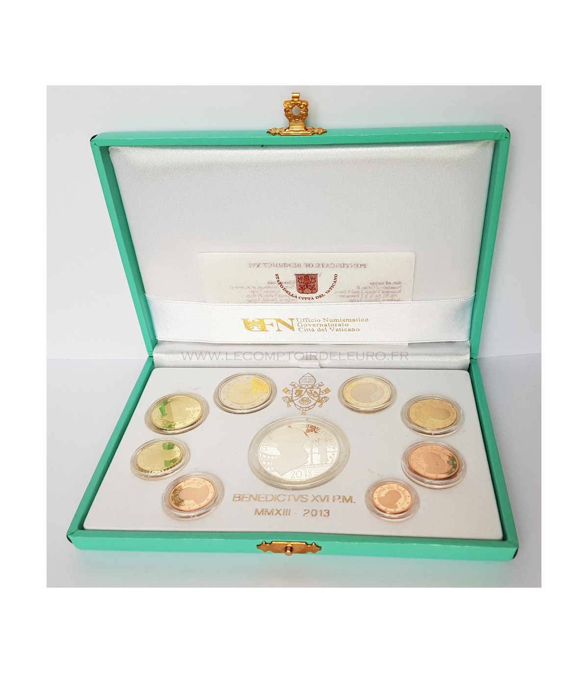 BENEDICT XVI's officiële BE 2013 box met 9 munten waaronder de 8 €1c tot €2 munten in de 2013 vintage met de beeltenis van paus Benedictus XVI in Proof kwaliteit en een €20 herdenkingsmunt in zilver met als thema 10 jaar Vaticaan Euro.