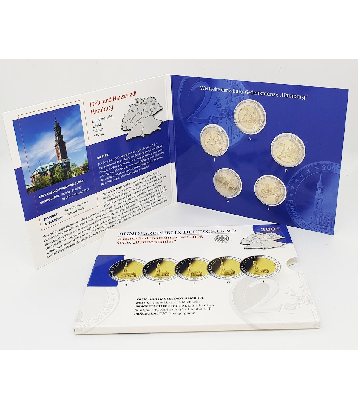 Para assinalar a presidência de Hamburgo do Bundesrat, a Alemanha emitiu a terceira moeda comemorativa de 2 euros sobre os Länder em 2008. A parte interior da moeda exibe a Igreja de São Miguel, em Hamburgo. Por baixo do monumento, encontra-se o nome do LandHAMBURG. À direita do monumento, de baixo para cima, figuram a inicial O do gravador e a insígnia da casa da moeda, representada por uma das letras A (Berlim), D (Munique), F (Estugarda), G (Karlsruhe) ou J (Hamburgo). Na parte inferior da coroa circular externa, figura a menção "UNDESREPUBLIK DEUTSCHLAND" e, na parte superior, o ano de 2008 e doze estrelas. No bordo, está gravado: EINIGKEIT UND RECHT UND FREIHEIT e a águia federal.