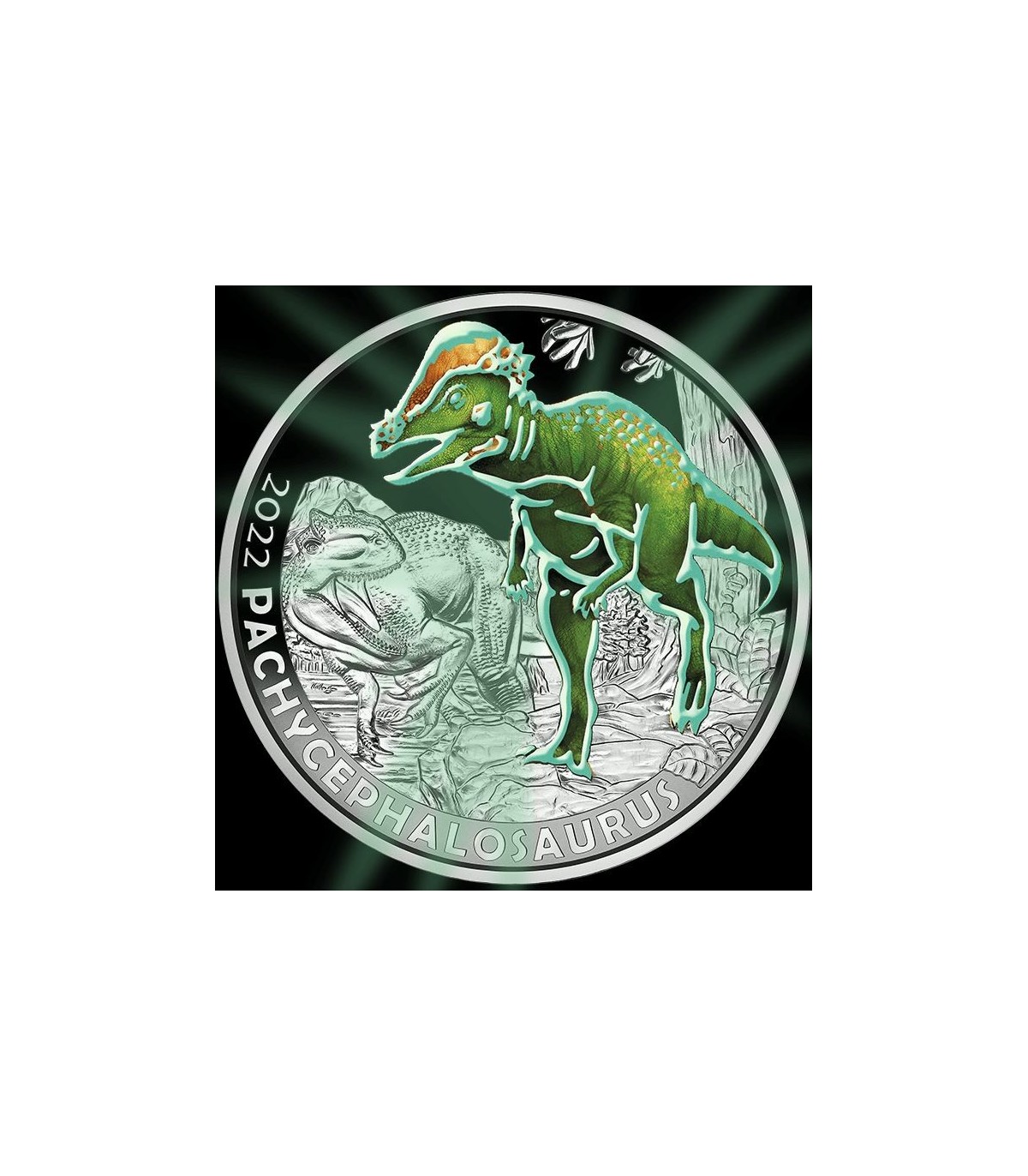 O Pachycephalosaurus wyomingensis apresenta os 12 animais pré-históricos extremos da série Supersaurs em silhueta no seu anverso. O anverso apresenta um paquicefalossauro impresso a cores, ameaçado por um alossauro predador numa paisagem pré-histórica. Todas as moedas de 3 euros da série têm curso legal na Áustria.