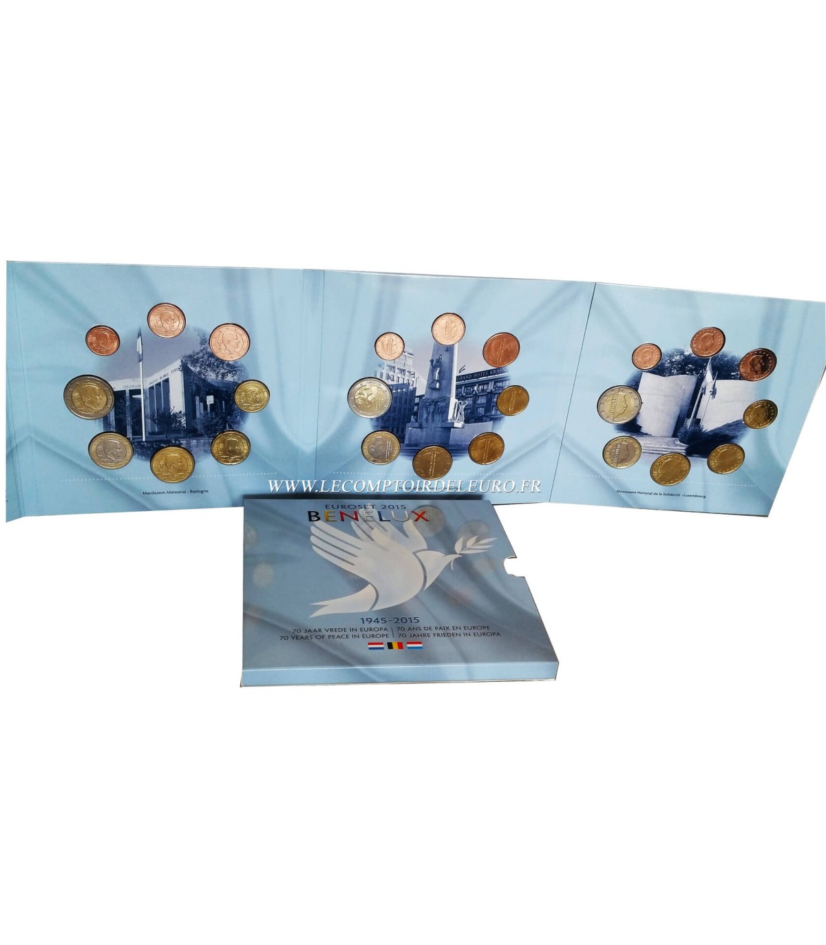 3 séries completas de moedas de 2015, de 1 cêntimo a 2 euros, dos Países Baixos, da Bélgica e do Luxemburgo, e uma medalha sobre o tema dos 70 anos de paz na Europa
