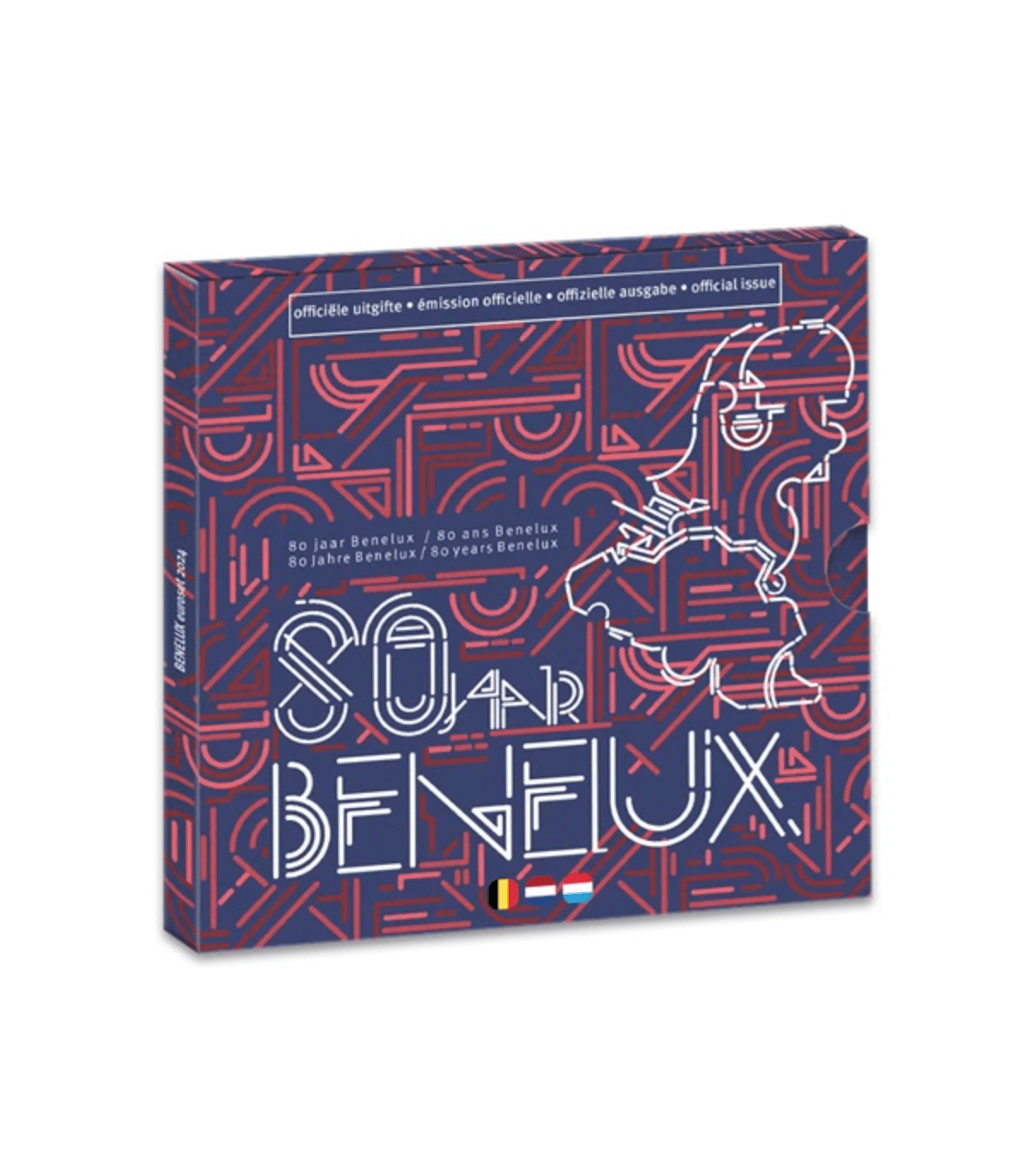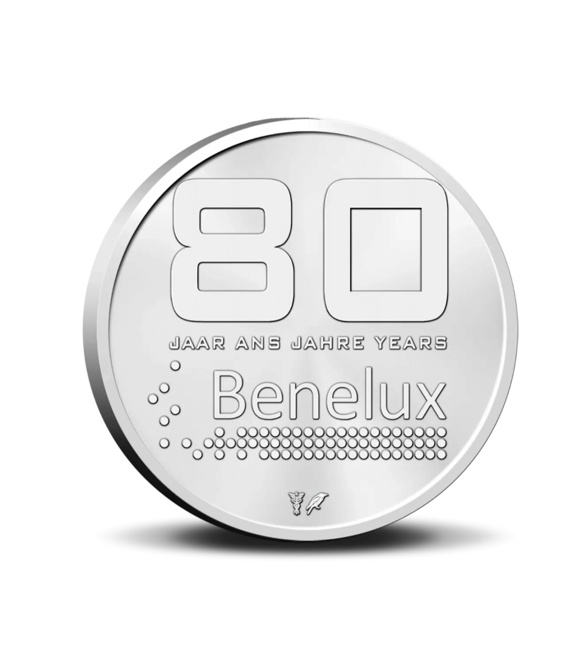 O conjunto inclui igualmente uma medalha exclusiva com um diâmetro de 30 mm. Na frente: 80 YEARS JAHRE YEARS e o logótipo oficial do Benelux. A marca da casa da moeda e a marca do mestre-gravador também estão presentes. No reverso, o mapa do Benelux, rodeado por setas que indicam a interação, os três pilares actuais da ideia do Benelux: ECONOMIA => SUSTENTABILIDADE => SEGURANÇA.