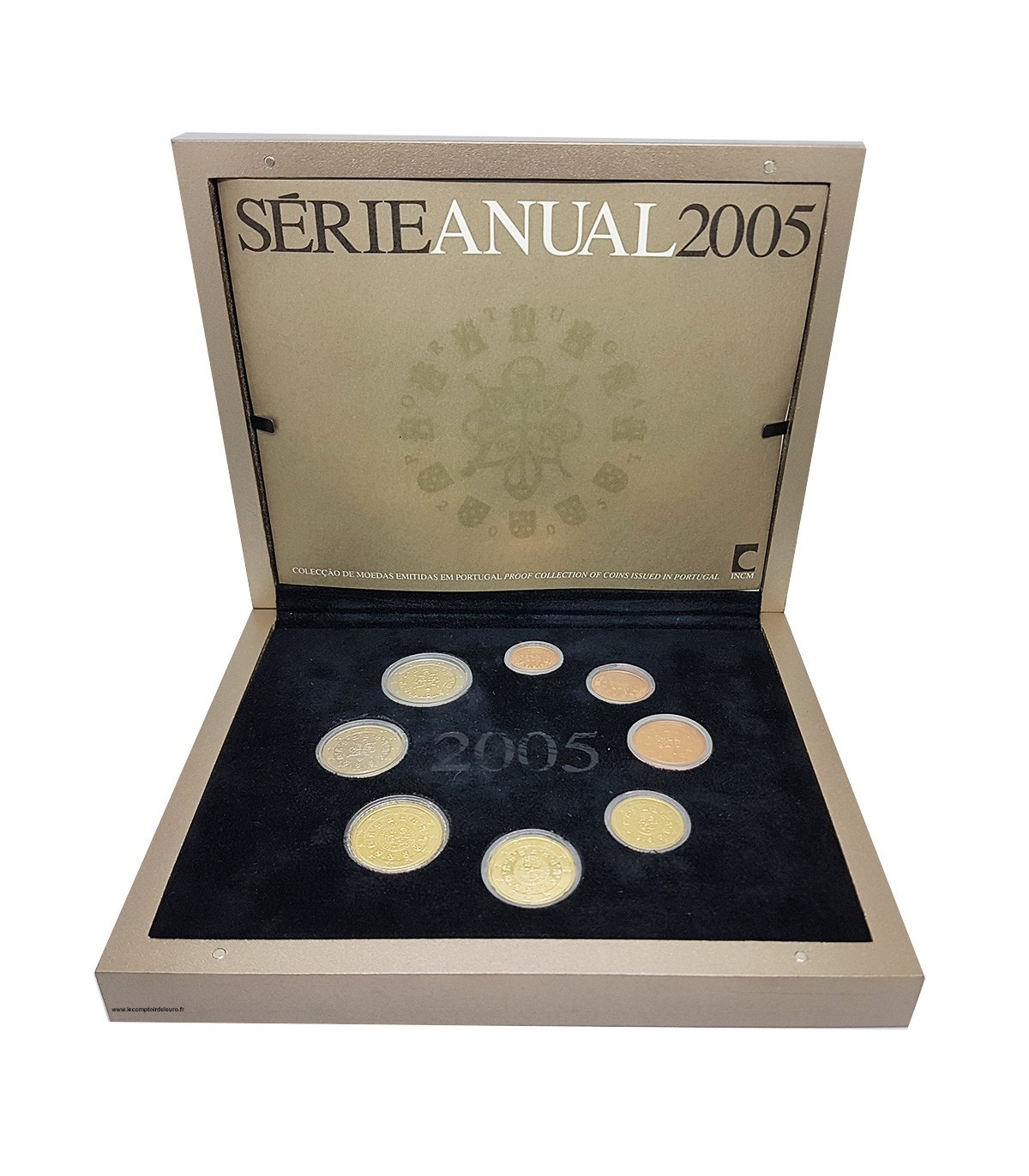 Série numa caixa Fine Proof BE Portugal 2005 contendo as 8 moedas de 1 cêntimo a 2 euros.