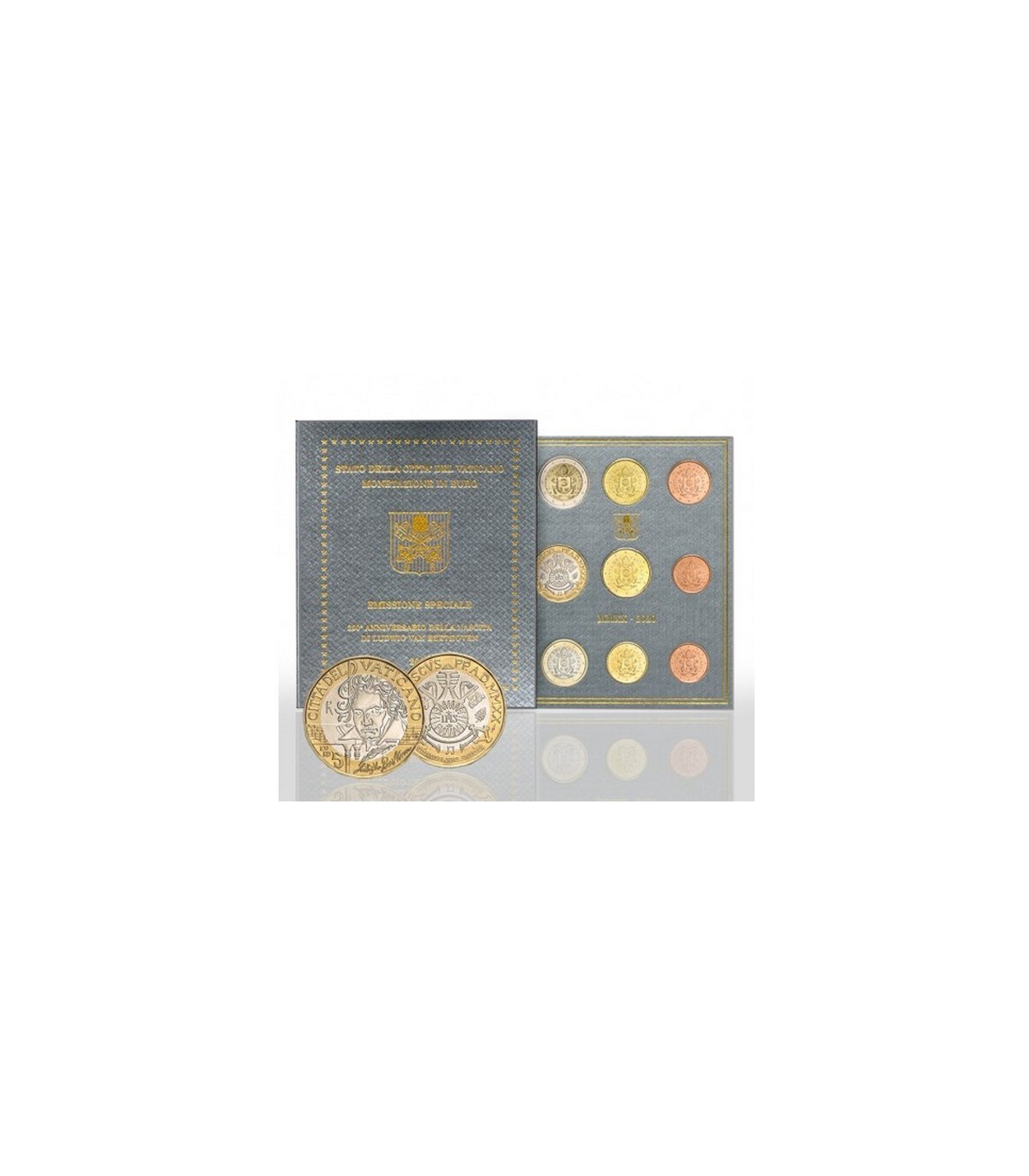 Nova caixa universal brilhante do Vaticano de 2020, incluindo a moeda de 5 euros comemorativa do 250.º aniversário do nascimento de Ludwig van Beethoven.
