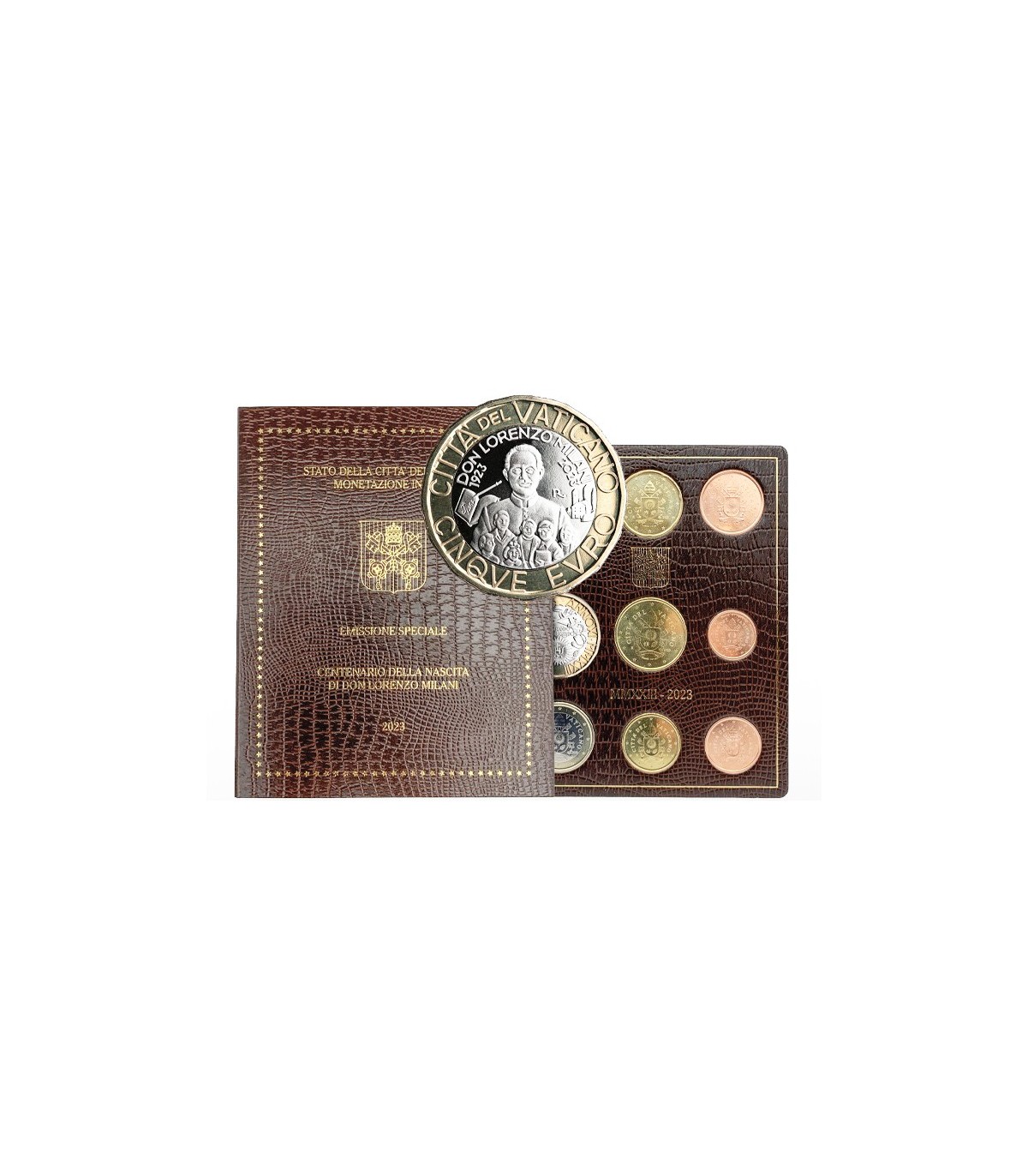 Este conjunto inclui as moedas de 1 e 2 euros para 2023 com o brasão do Papa Francisco I (escudo) e a moeda de 5 euros comemorativa do centenário da morte de Don Lorenzo Milani.
