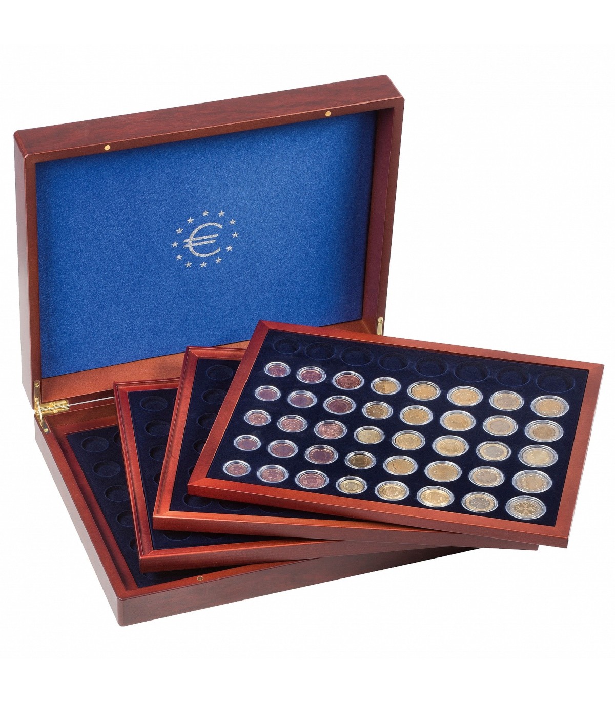 Porta-moedas em mogno para 24 séries completas de euros em cápsulas (1 cêntimo a 2 euros).4 tabuleiros revestidos de feltro azul, cada um com 48 compartimentos redondos para 6 conjuntos completos de euros.a solidez dos tabuleiros é reforçada por uma moldura de madeira.o interior da tampa é forrado de cetim azul com estampado prateado.sistema de fecho magnético discreto e seguro.