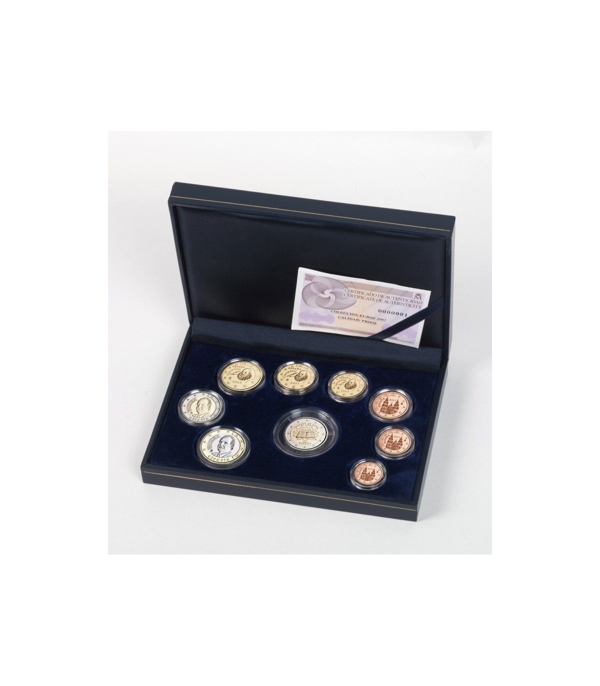 A série de Espanha é apresentada numa caixa de prova fina que inclui as 8 moedas de 1 a 2 euros da cunhagem de 2002 e a moeda comemorativa de 2 euros "Quinquagésimo aniversário do Tratado de Roma"