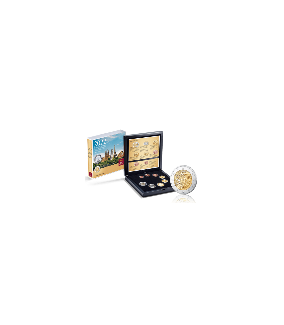 Conjunto de caixas contendo as moedas de 1 cêntimo a 1 euro para o ano de 2022 e a edição comemorativa de 2 euros Erasmus