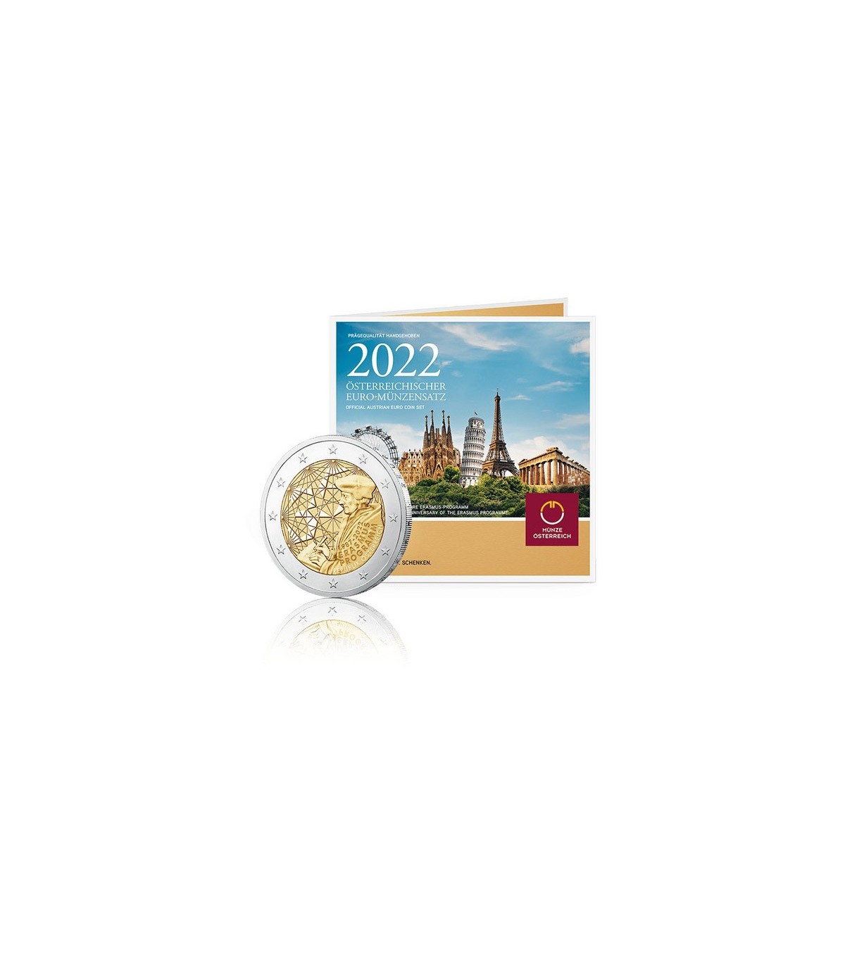 Em 2022, os países da União Económica e Monetária da UE celebram o 35.º aniversário da criação do programa Erasmus com a emissão de uma moeda Erasmus especial de 2 euros. A moeda é o coroamento deste conjunto oficial de moedas austríacas de 2022 euros, que consiste em oito moedas especiais de qualidade não circulada, com valores entre 1 cêntimo e 2 euros.