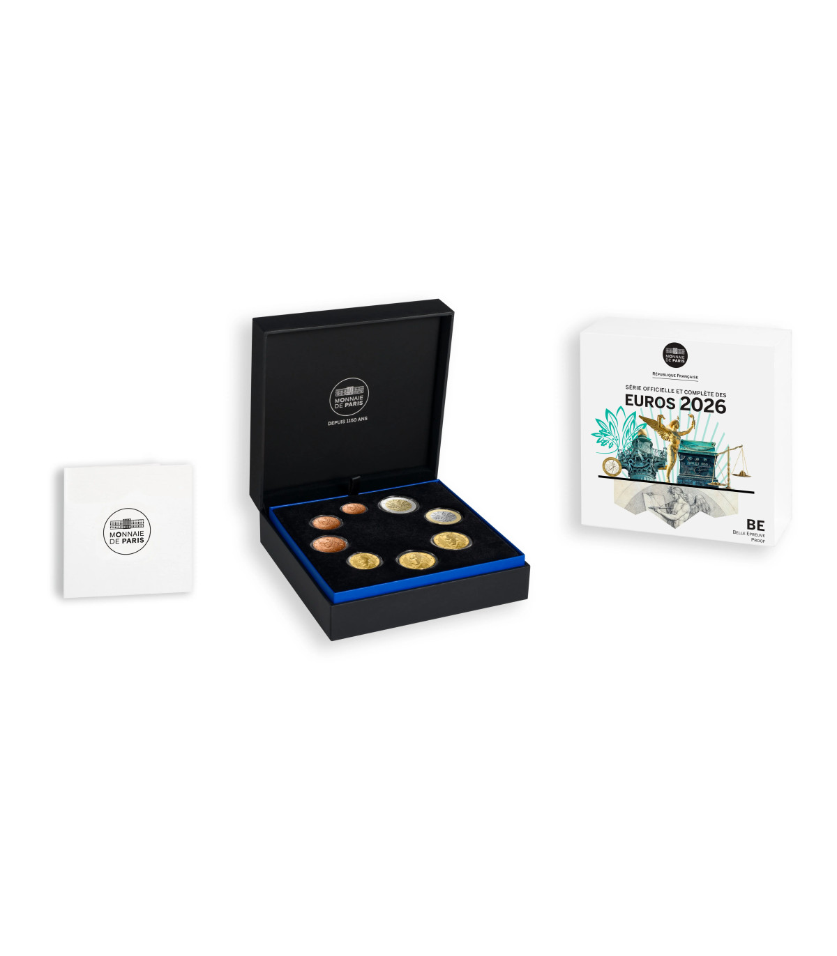 O conjunto de caixas oficial Monnaie de Paris BE 2026 inclui todas as 8 moedas francesas de 1 cêntimo a 2 euros do ano 2026. Apresentado numa caixa moderna.