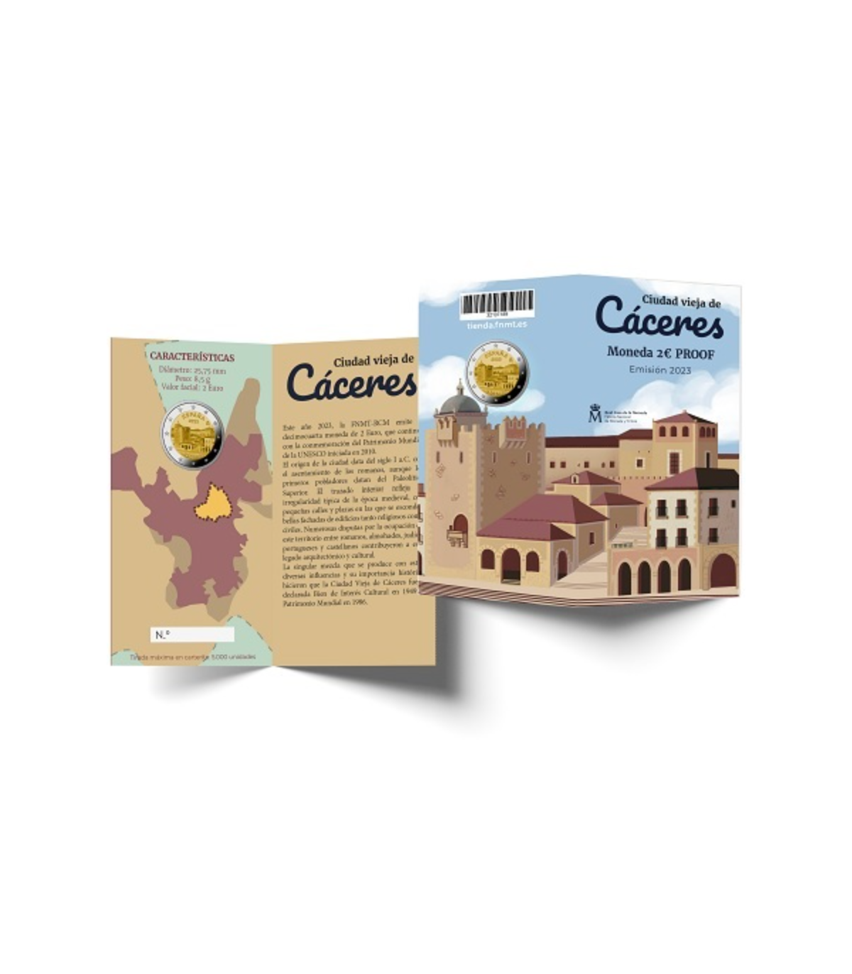Moeda comemorativa de 2 euros Espanha 2023 sobre o tema da cidade de Cacéres em qualidade de prova