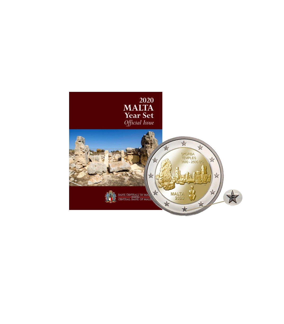 Caixa Universal Brilhante BU Malta 2020 de 9 moedas, incluindo a moeda comemorativa de 2 euros de 2020 sobre o tema do templo de Skorba, classificado como Património Mundial da UNESCO.