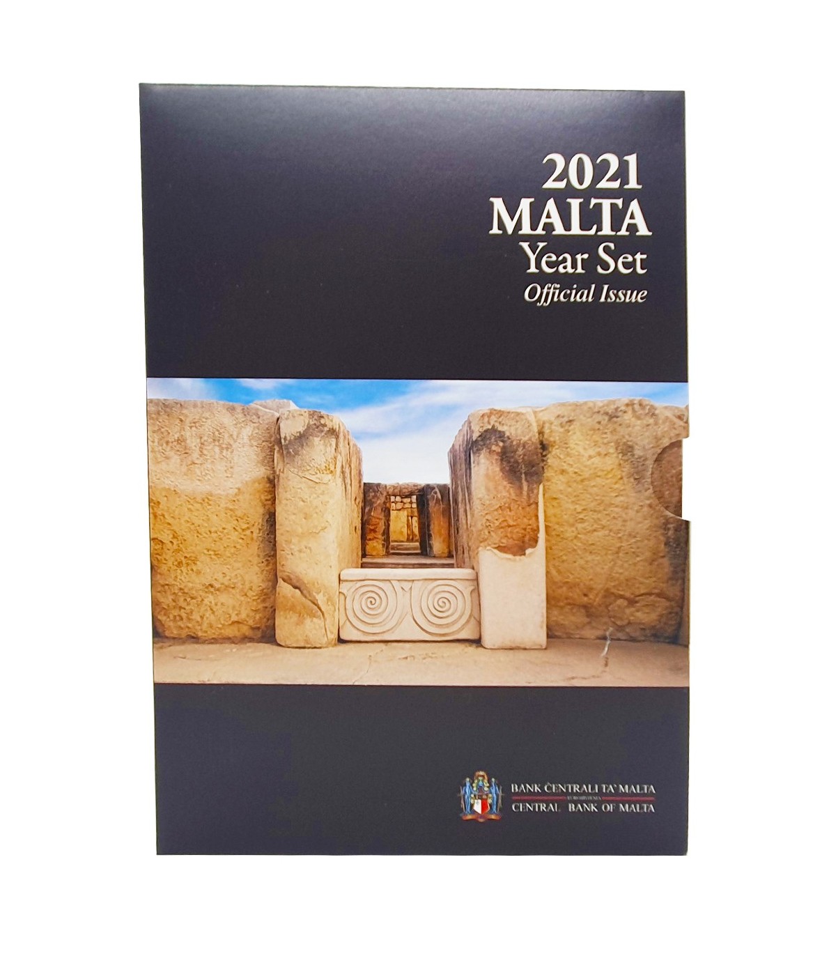 Caixa de 9 moedas combinando as moedas de 1 cêntimo a 2 euros do ano 2021 + a moeda comemorativa de 2 euros de 2021 sobre o tema dos templos Tarxianos. (moeda com as diferentes caraterísticas da moeda maltesa com a letra F).