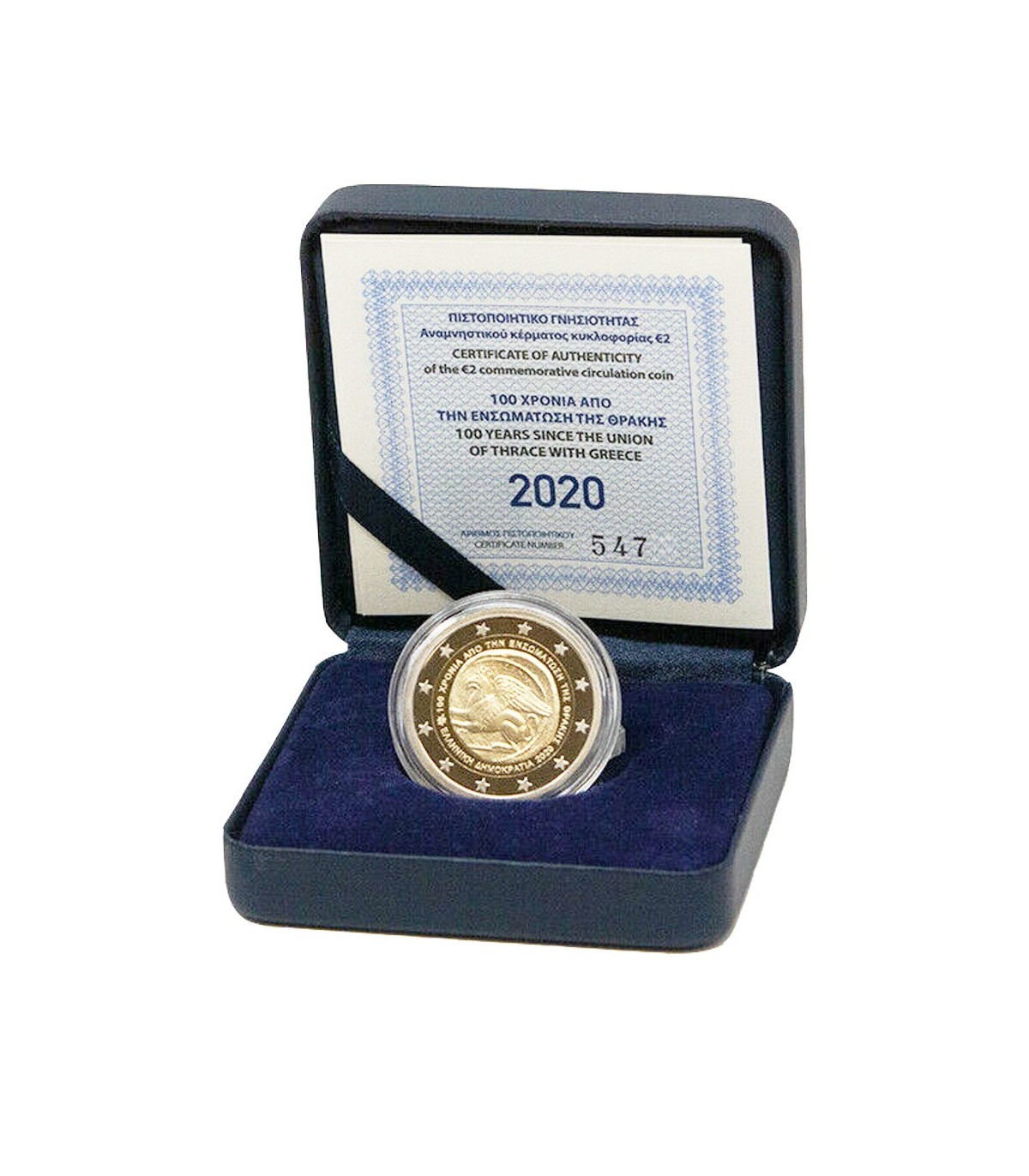 Moeda comemorativa de 2 euros da Grécia 2020 em qualidade Fine Proof sobre o tema do 100.º aniversário da União da Trácia.