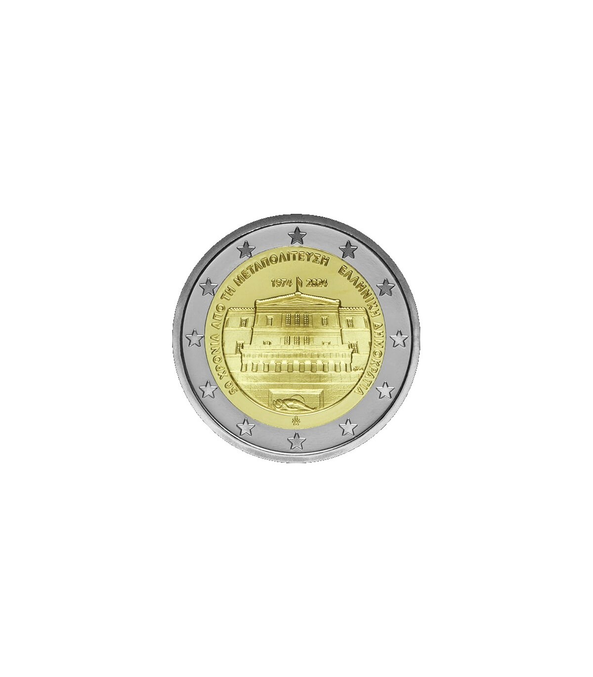 A moeda de 2 euros emitida pela Grécia em 2024 celebra o 50.º aniversário da restauração da democracia, um acontecimento fundamental na história grega moderna. Em 1974, após sete anos sob um regime autoritário conhecido como a ditadura dos coronéis, a Grécia regressou ao regime democrático. Este momento histórico foi marcado pela queda deste regime em 24 de julho de 1974, na sequência de um golpe militar e de uma série de crises políticas que abalaram o país.