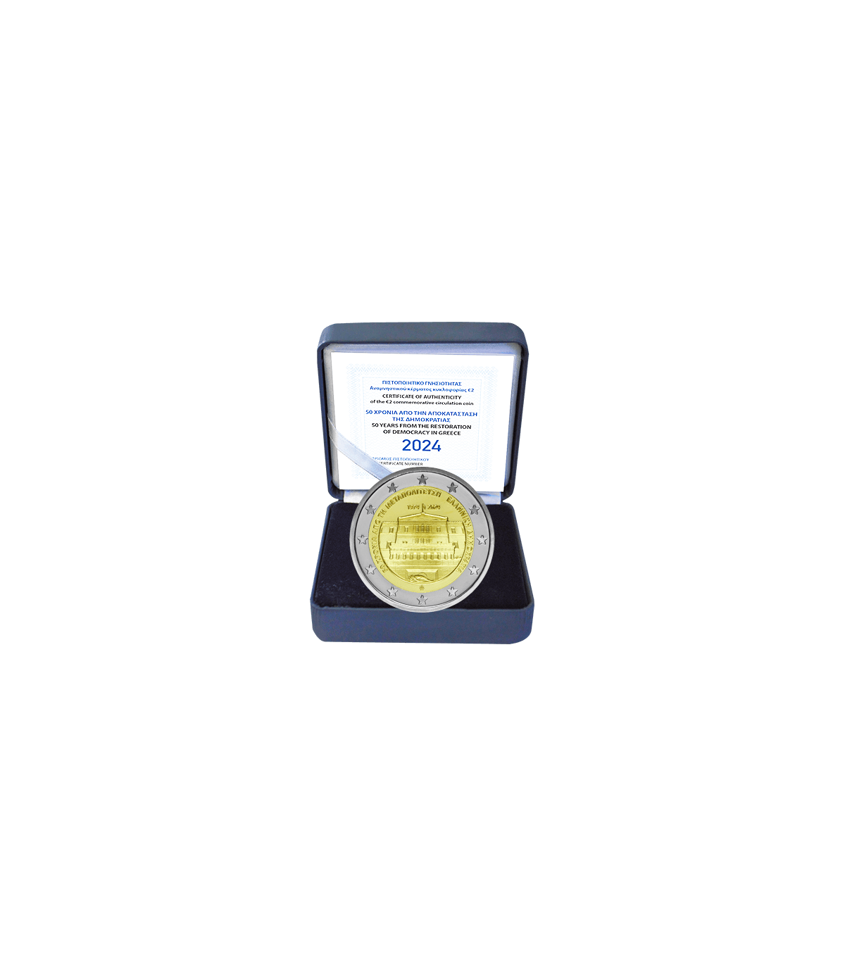 A moeda de 2 euros emitida pela Grécia em 2024 celebra o 50.º aniversário da restauração da democracia, um acontecimento fundamental na história grega moderna. Em 1974, após sete anos sob um regime autoritário conhecido como a ditadura dos coronéis, a Grécia regressou ao regime democrático. Este momento histórico foi marcado pela queda deste regime em 24 de julho de 1974, na sequência de um golpe militar e de uma série de crises políticas que abalaram o país.