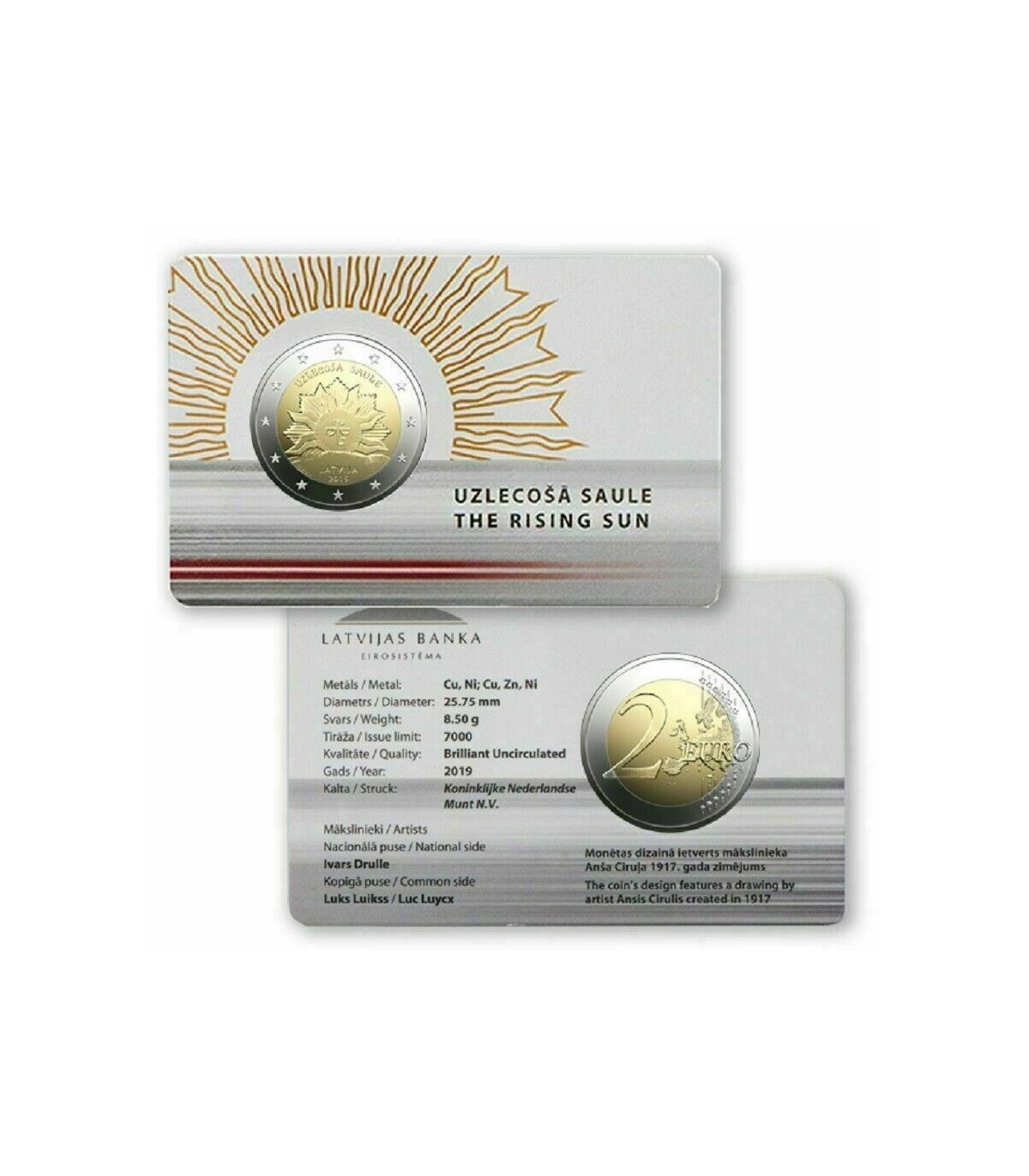 Coincard 2 euro Letónia 2019 Sol Nascente
