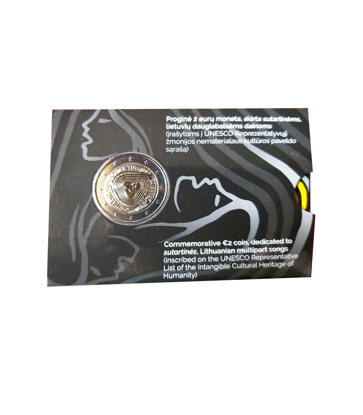 A face nacional da moeda apresenta padrões lineares, simbolizando melodias polifónicas do património único da Lituânia - as canções populares sutartinės . As linhas alargam-se e estreitam-se novamente, transformando-se num redemoinho adornado com várias figuras geométricas e naturais em miniatura. A moeda apresenta as inscrições LIETUVA (LITUÂNIA) e SUTARTINĖS (canções lituanas a várias vozes), o ano de emissão (2019) e a insígnia da casa da moeda lituana. Na parte exterior da moeda, estão incorporadas doze estrelas, tal como acontece na bandeira da União Europeia.