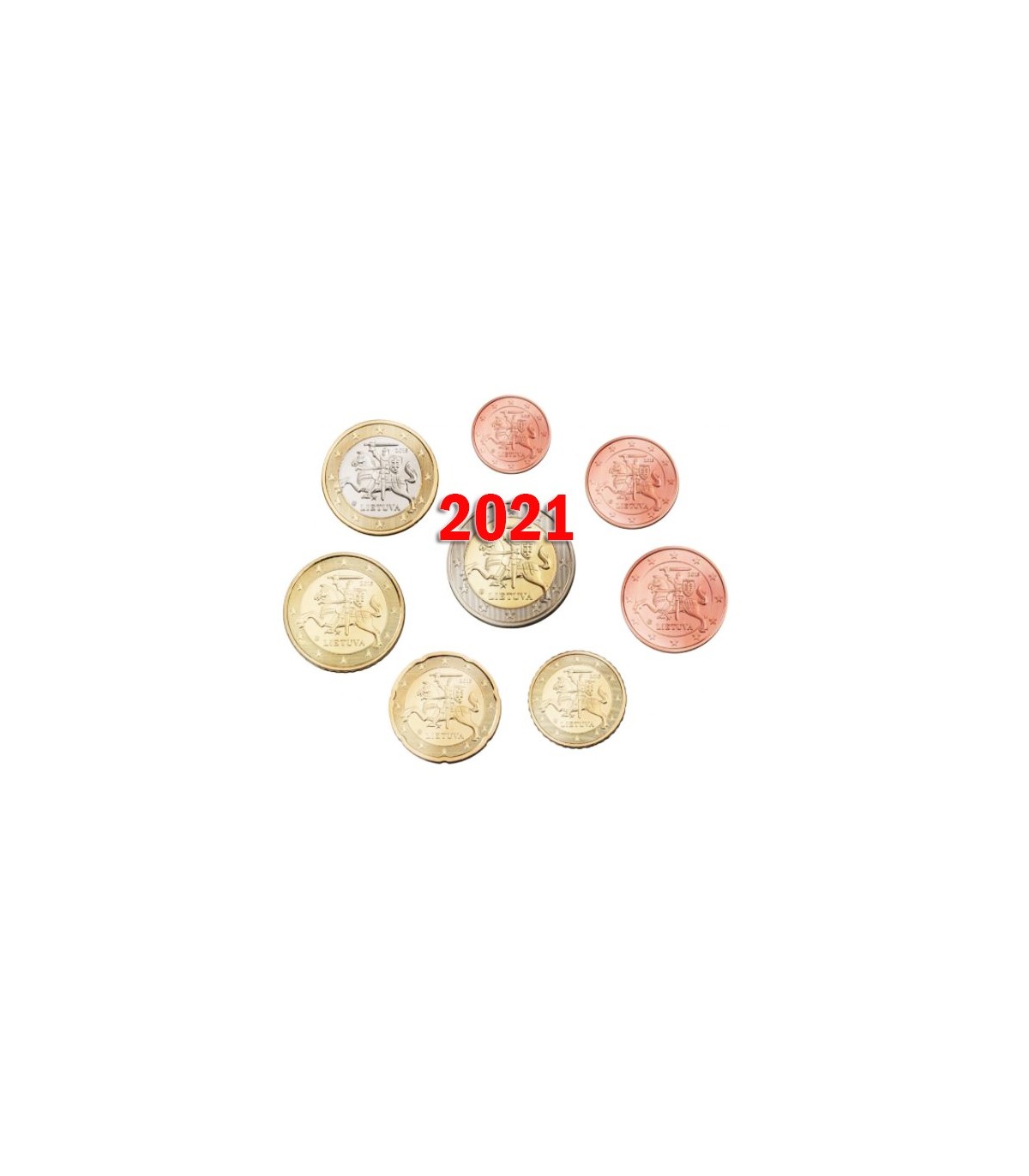 Série Euro Lituânia 2021 composta por um conjunto de 8 moedas de 1 cêntimo a 2 euros Lituânia 2021