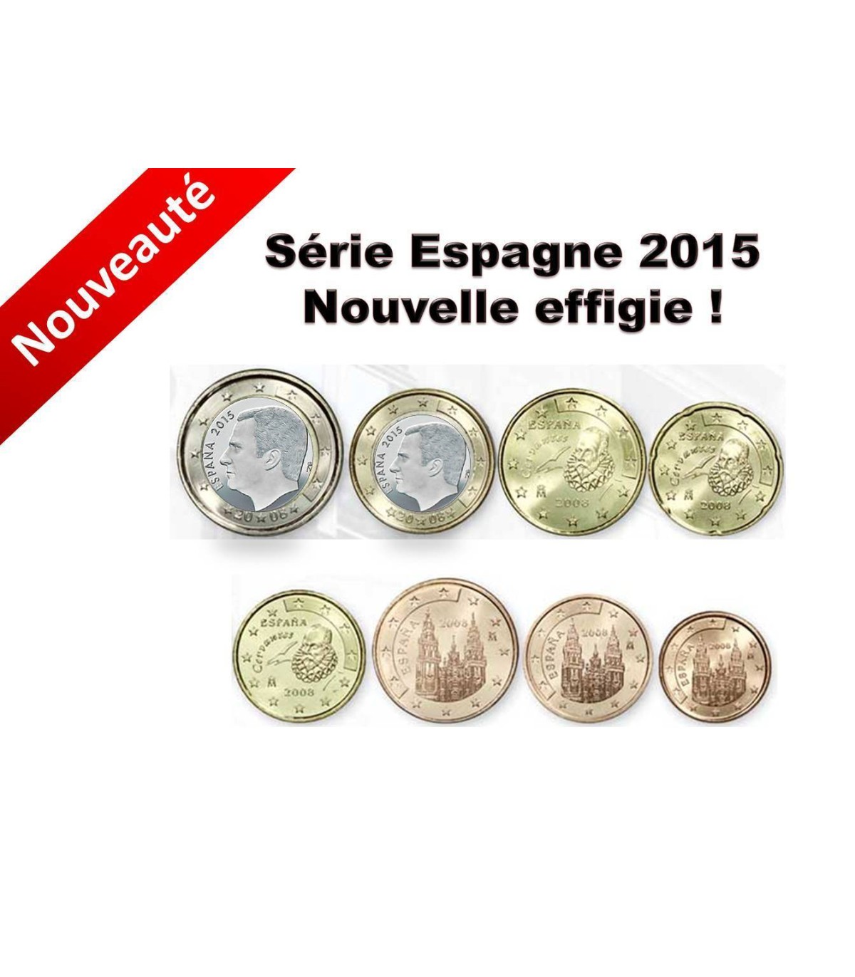 Série de 8 moedas que combinam o 1 centavo a 2 euros Espanha 2015, incluindo as moedas de 1 € e 2 € com a efígie do rei Felipe VI