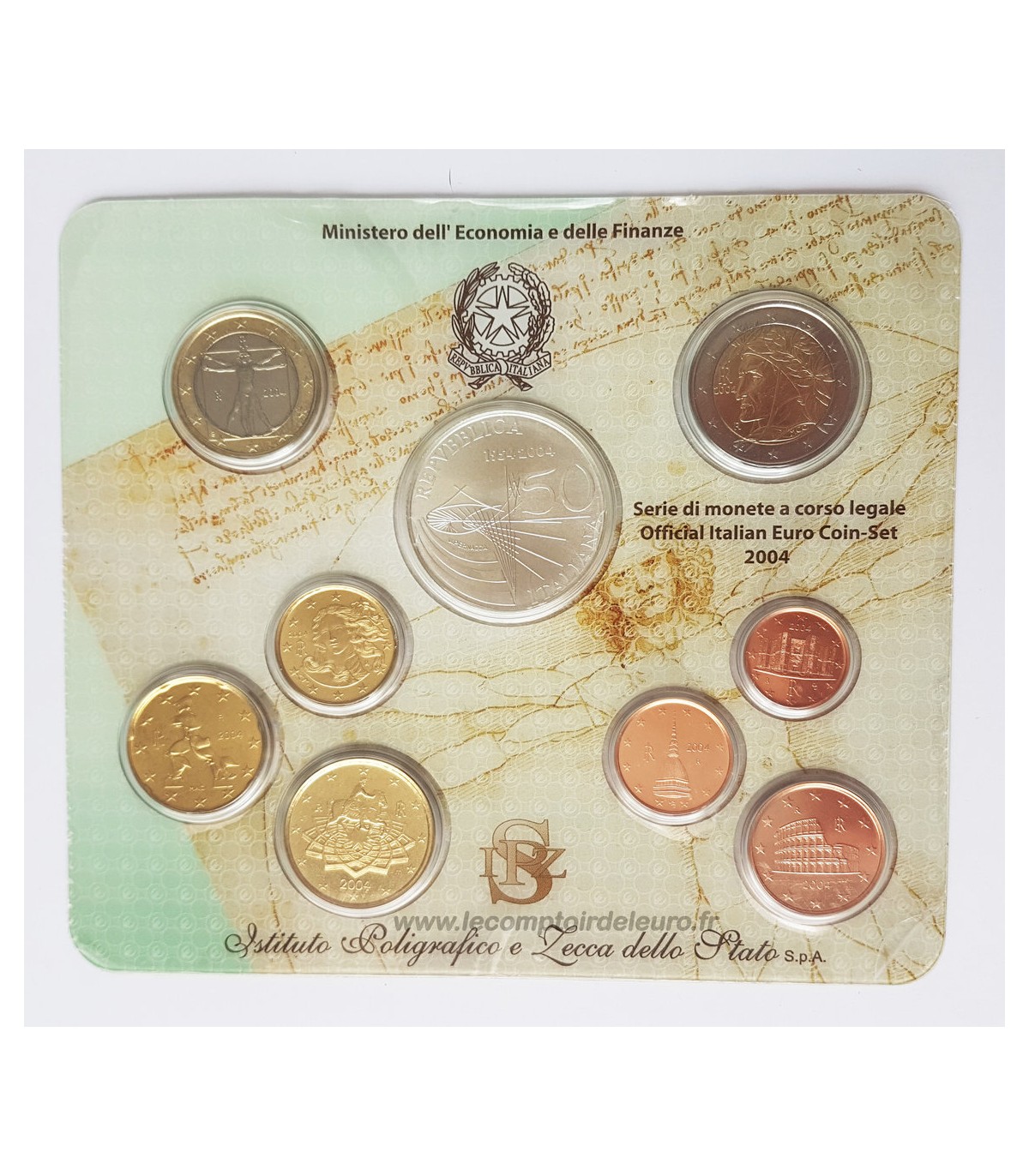 Esta caixa contém as 8 moedas de 1 cêntimo a 2 euros da Itália 2004,