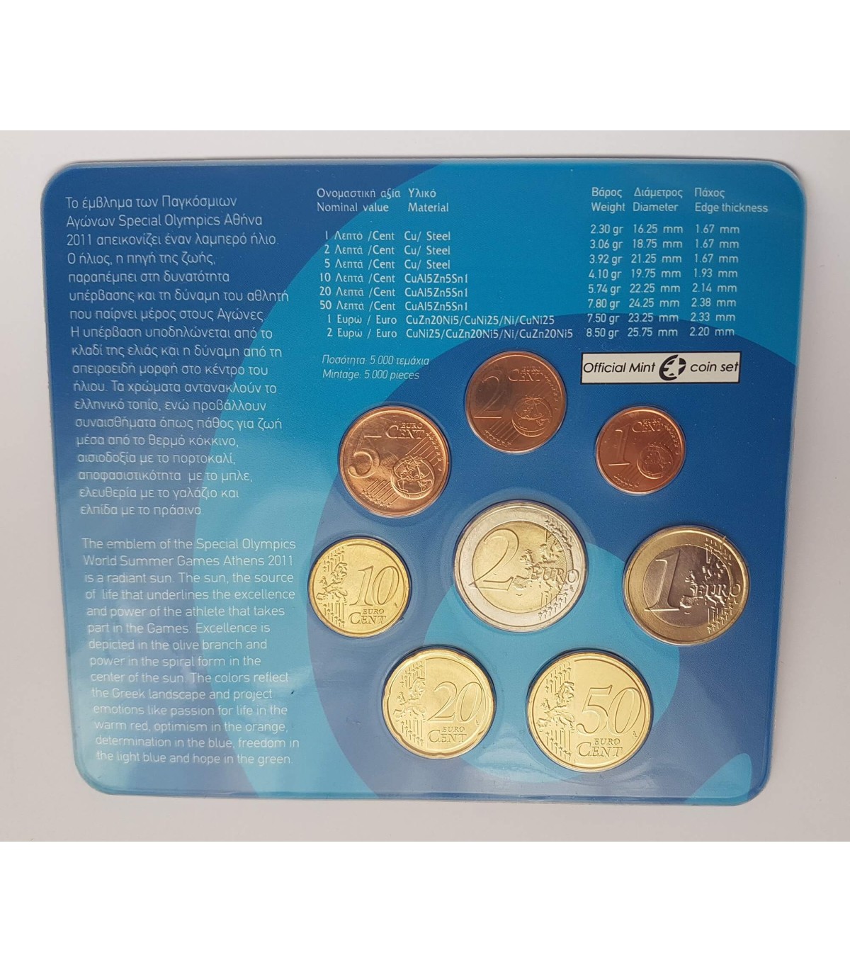 Conjunto de caixas BU 2011 incluindo uma série de 8 moedas de 1 cêntimo a 2 euros da Grécia.