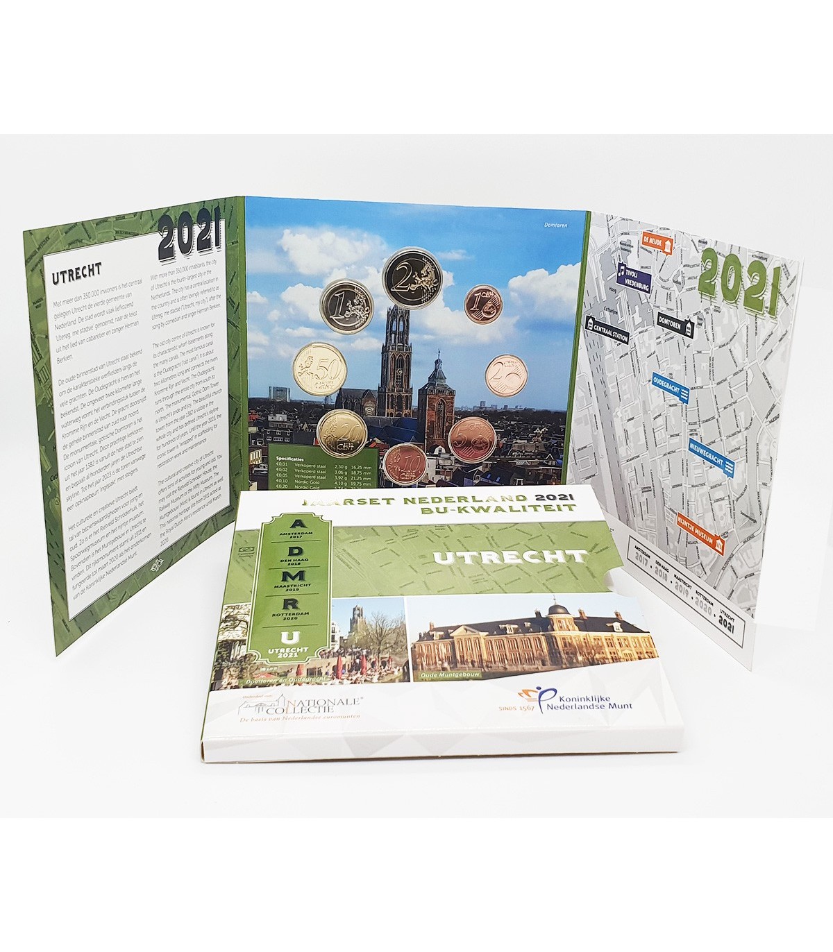 Estojo universal brilhante contendo as 8 moedas dos Países Baixos do ano 2021 da série "cidades dos Países Baixos" com a cidade de Utrecht.