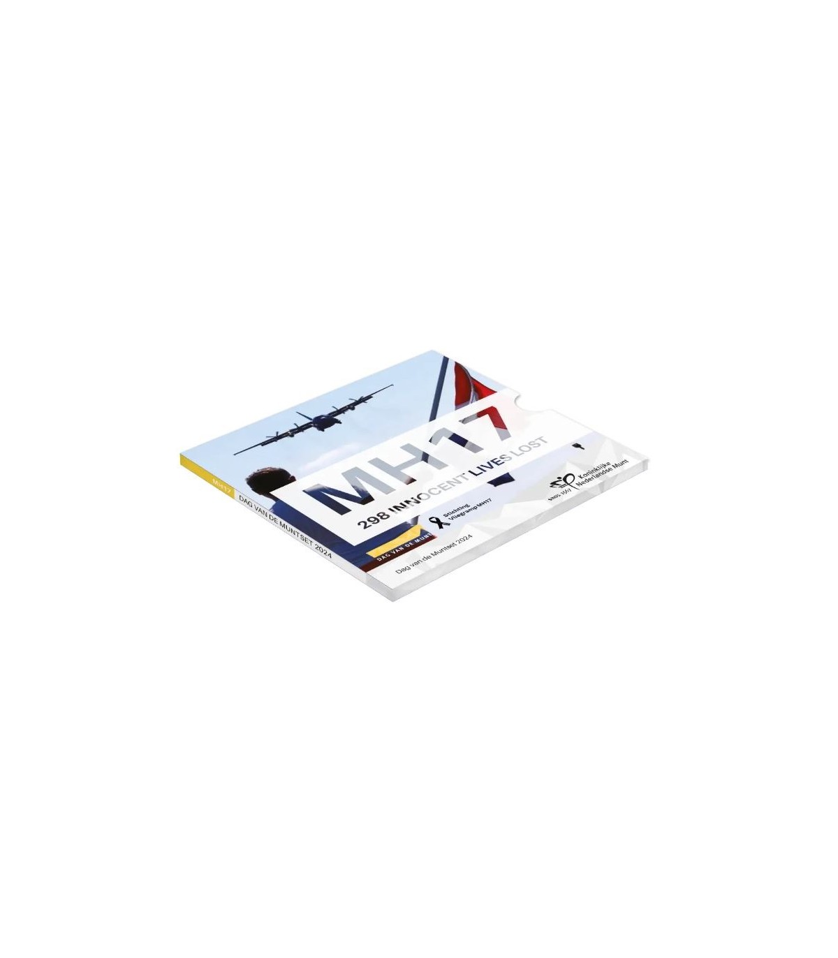O conjunto de caixas Day of the Mint 2024 presta homenagem a todas as vítimas desse dia horrível de 2014. A embalagem apresenta várias imagens, incluindo as do Monumento Nacional ao MH17 e imagens da chegada das vítimas aos Países Baixos. Para além das oito moedas de euro neerlandesas, receberá também uma medalha. O anverso da medalha mostra um homem que segura uma bandeira e observa a chegada de um avião. Esta é uma das fotografias mais famosas do MH17, tirada aquando da chegada do avião que transportava as vítimas. O texto na parte lateral diz "WE REMEMBER MH17 - 17 JULY 2014". O verso mostra flores, com um girassol no meio. Os girassóis também se encontram no Monumento Nacional. No centro da flor, encontra-se a palavra MH17.